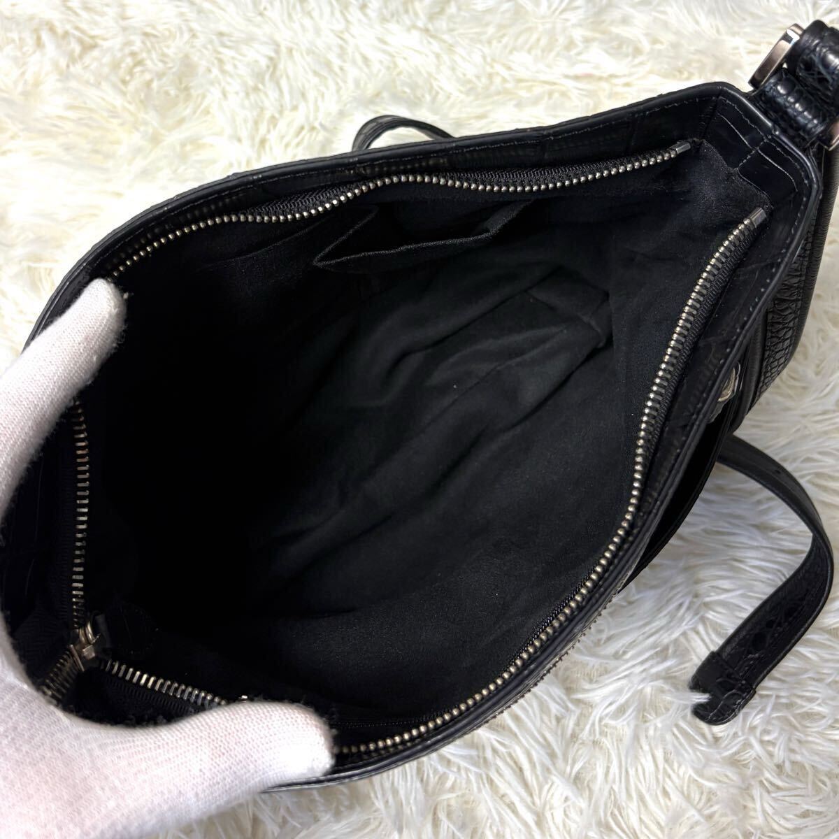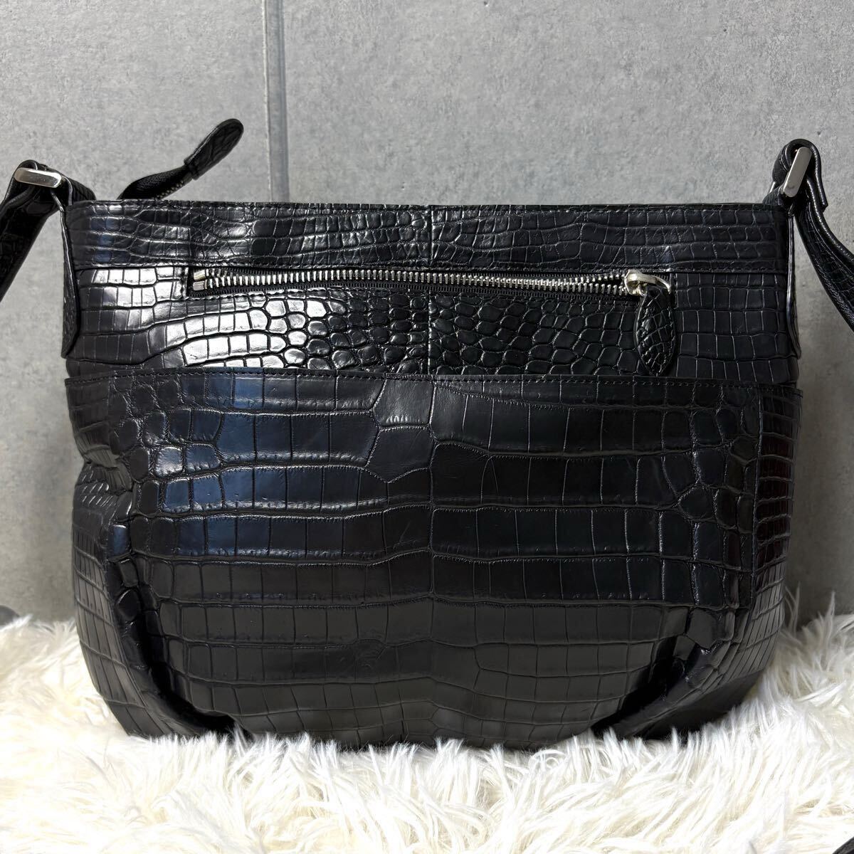 ほぼ未使用/センター取り ●リアルクロコダイル ショルダーバッグ ボディ サコッシュ メッセンジャー ブラック 黒 斜めがけ ワニ革 レザー