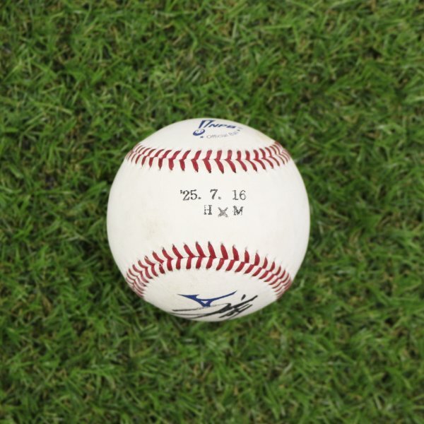 実際に試合で使用された公式球(NPB公認マーク入り)に、ヒーローインタビュー直後の興奮冷めやまぬなかで勝利の記録を残すためにサインした大変貴重なボールです。