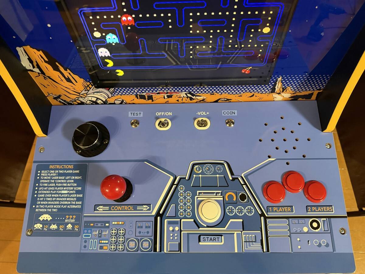 コンパネ部に電源スイッチと音声ボリューム、テストボタン、コイン投入(サービスボタン)も付けてあります。