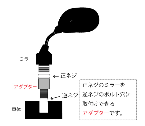 正ネジから逆ネジに変換しますので車体とミラーの間に装着するだけ!