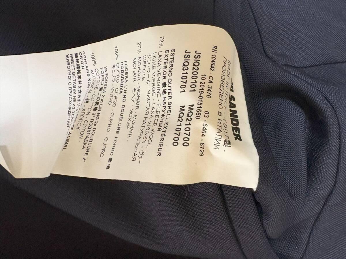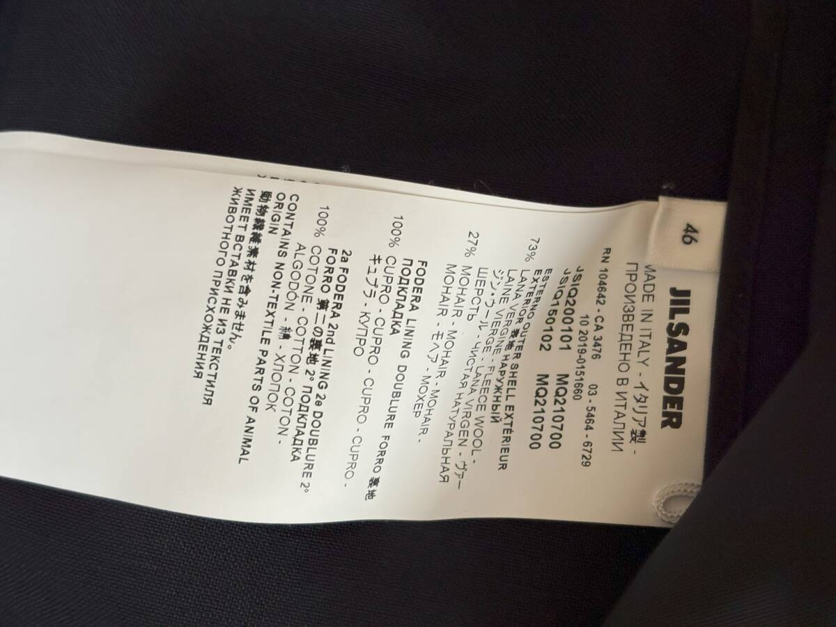 ジルサンダー(JIL SANDER)の春夏ウール・モヘア混スーツ、ネイビー サイズ46です。裏地なしの春夏もの、ウール・モヘア混でやや光沢があります。定番スーツで、ビジネスはもちろん、ジャケットとパンツ別々にカジュアル場面でもコーディネイトできます。素材はウール73%,モヘア27%。元supremeヘッドデザイナー、現OAMCのデザイナールークメイヤーによるデザインです。ルークのジルサンダーらしく他のトップブランドに比べても、もう一段上質な生地を使っています。日本での定価は23万円くらいだと思います。