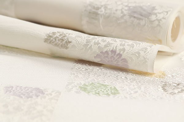 全体には白色や薄い水色鼠色、薄紫色、亜麻色、紫鼠色、薄緑色のお色目で、市松状に唐花文様が織り上げられております。