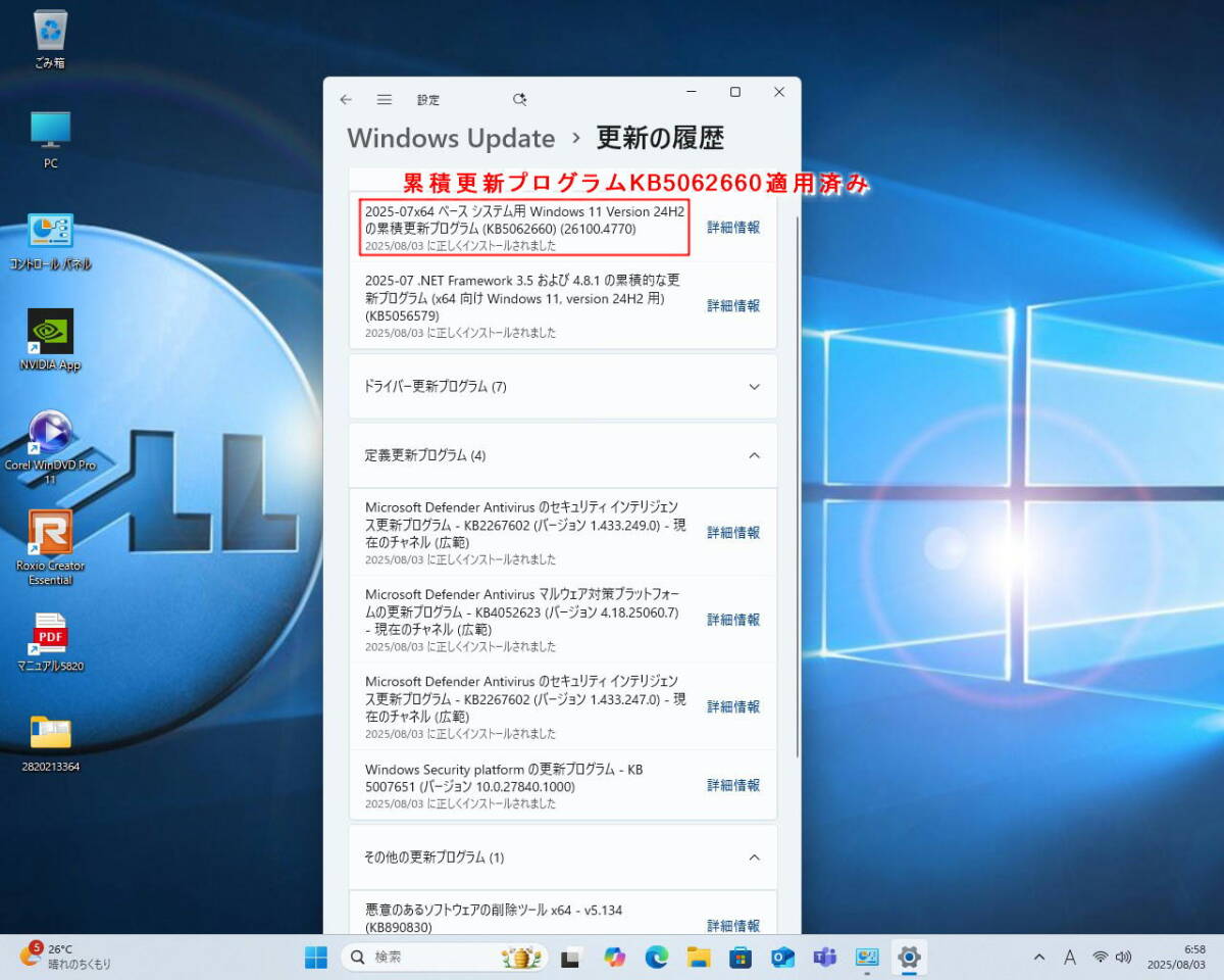 Windows Update 更新プログラム及びWindows Defender ウイルス対策は、8月3日まであててあります。