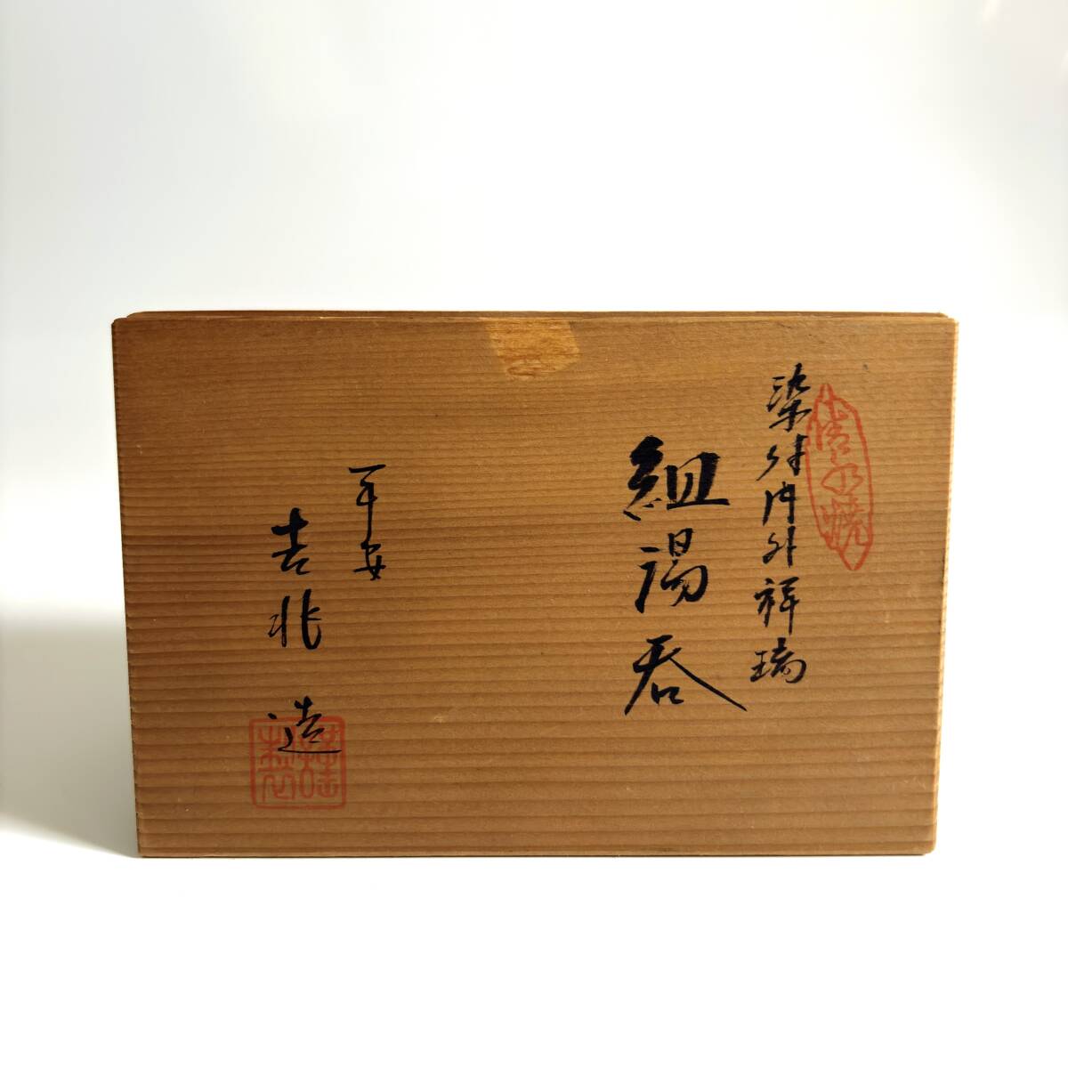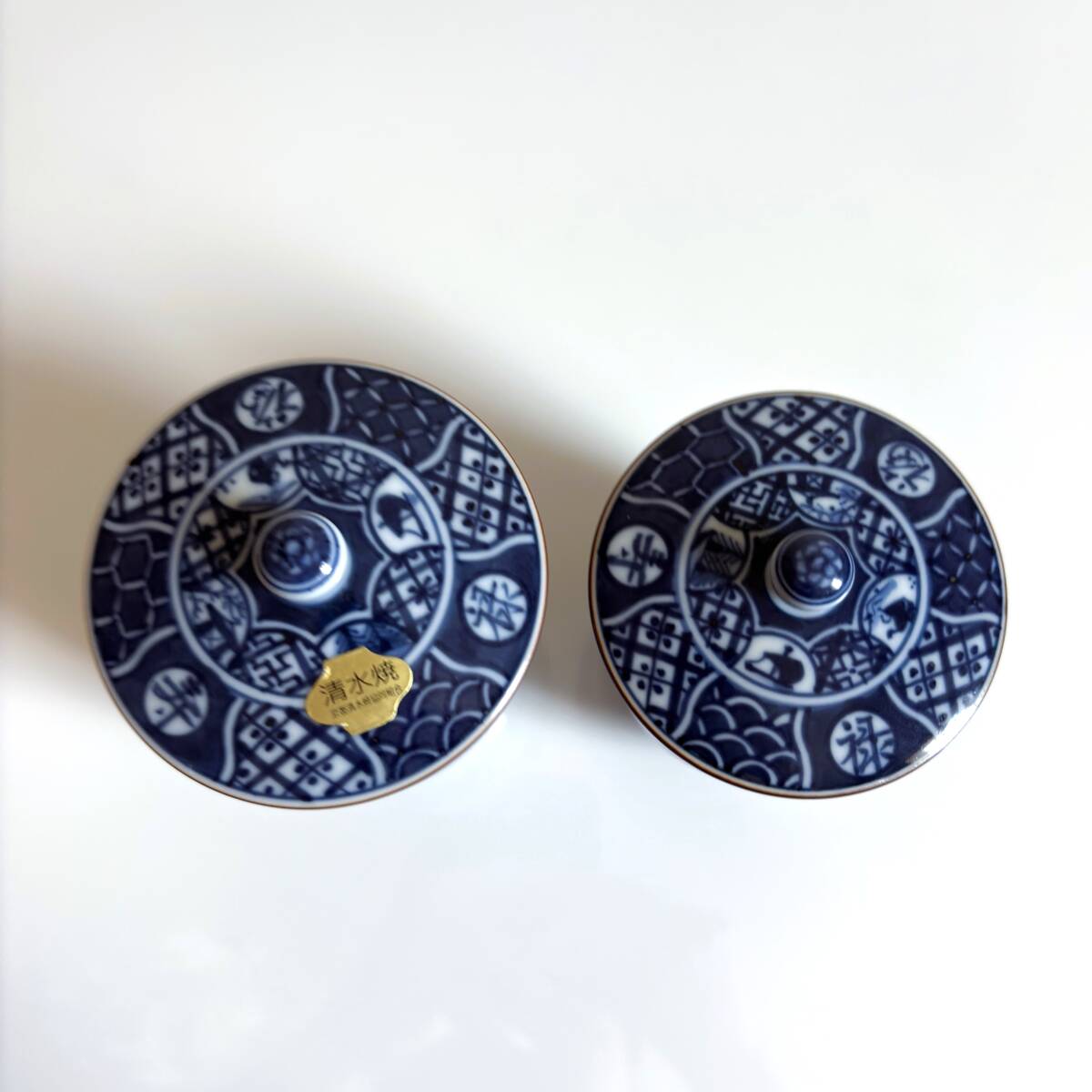 清水焼の染付細湯呑、吉兆銘入りの共箱付き2客セットです。武士の姿や家紋風の図案が描かれた、物語性のある吉祥文様。縁起の良い青海波や扇面を配し、格式ある雰囲気を醸し出しています。蓋付きのため保温性も高いです。一客(高い方)は未使用品です。もう一客(低い方)は高台内に茶渋汚れが見られますが、全体として良好なコンディションです。