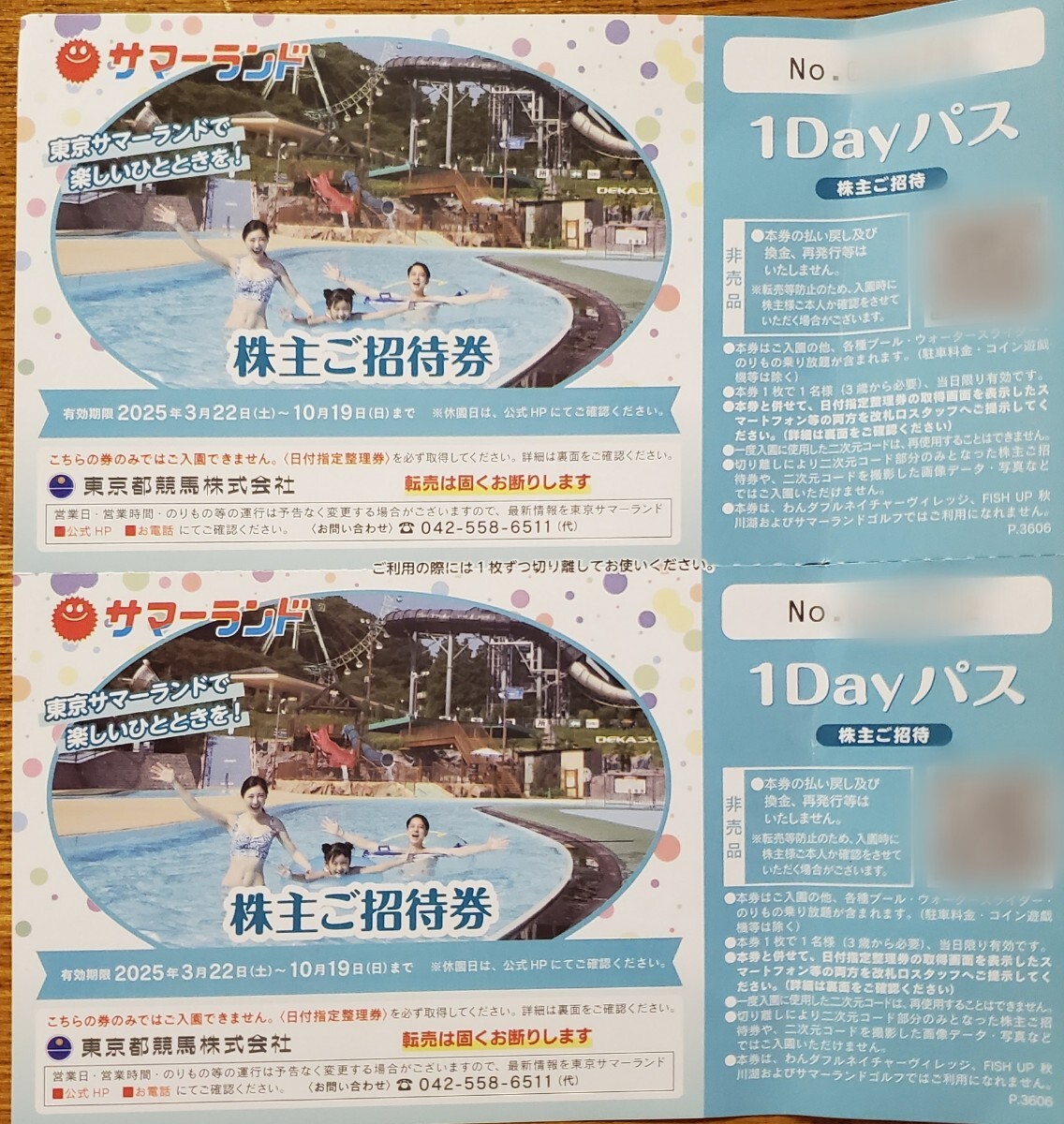 Product name: 東京サマーランド 1Dayパス 2枚セット 株主優待 2025年10月19日まで有効(日付指定整理券取得必要)