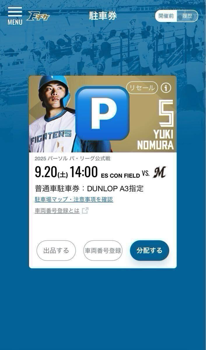 エスコンフィールド北海道 エスコン 駐車券 DUNLOP A3 電子チケット 9/20
