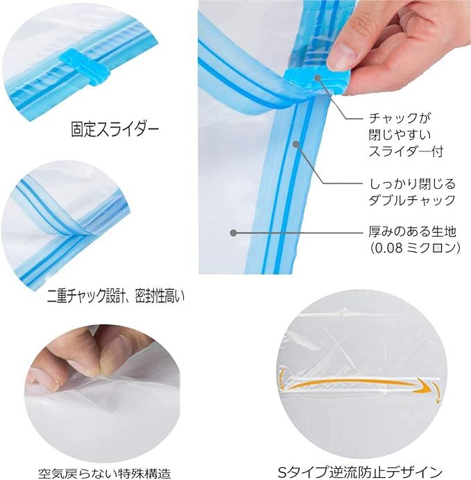 • 優れた密封性: 圧縮袋はダブルジッパーを採用してシールします。しっかりシールして空気が入れません。真空状態で収納されていますので、湿気、埃、ダニやカビなどの侵入を防ぎ、常に清潔に保管して頂けます。