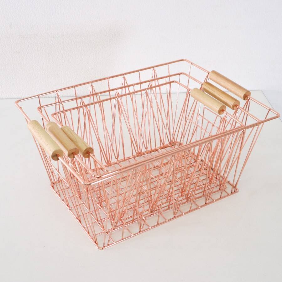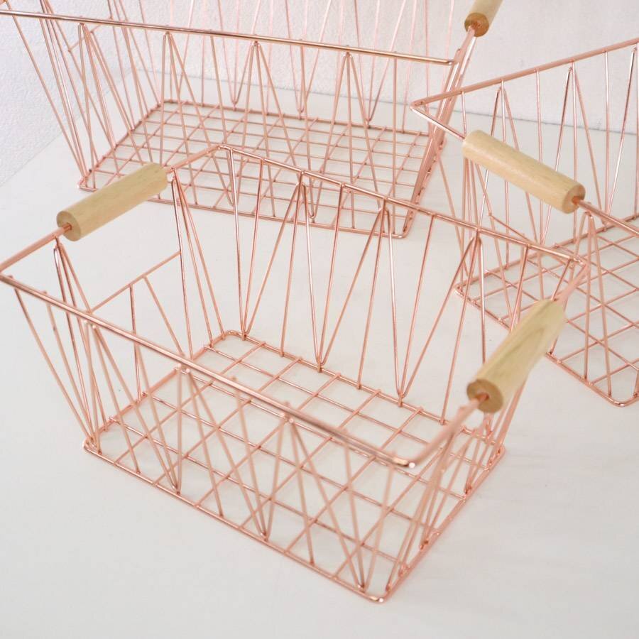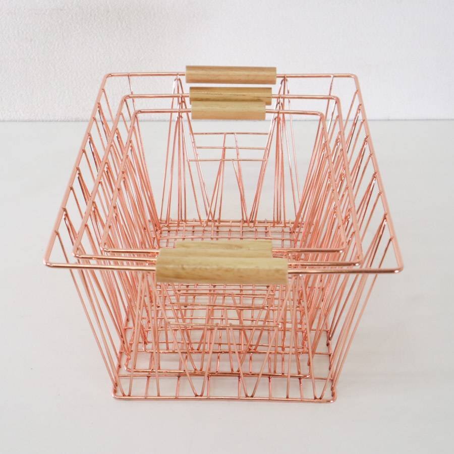 新品 amazon basics ワイヤーバスケット 3個セット(39cm/34cm/29cm) ウッドハンドル コッパー色 スタッキング可能 小物収納★193h13