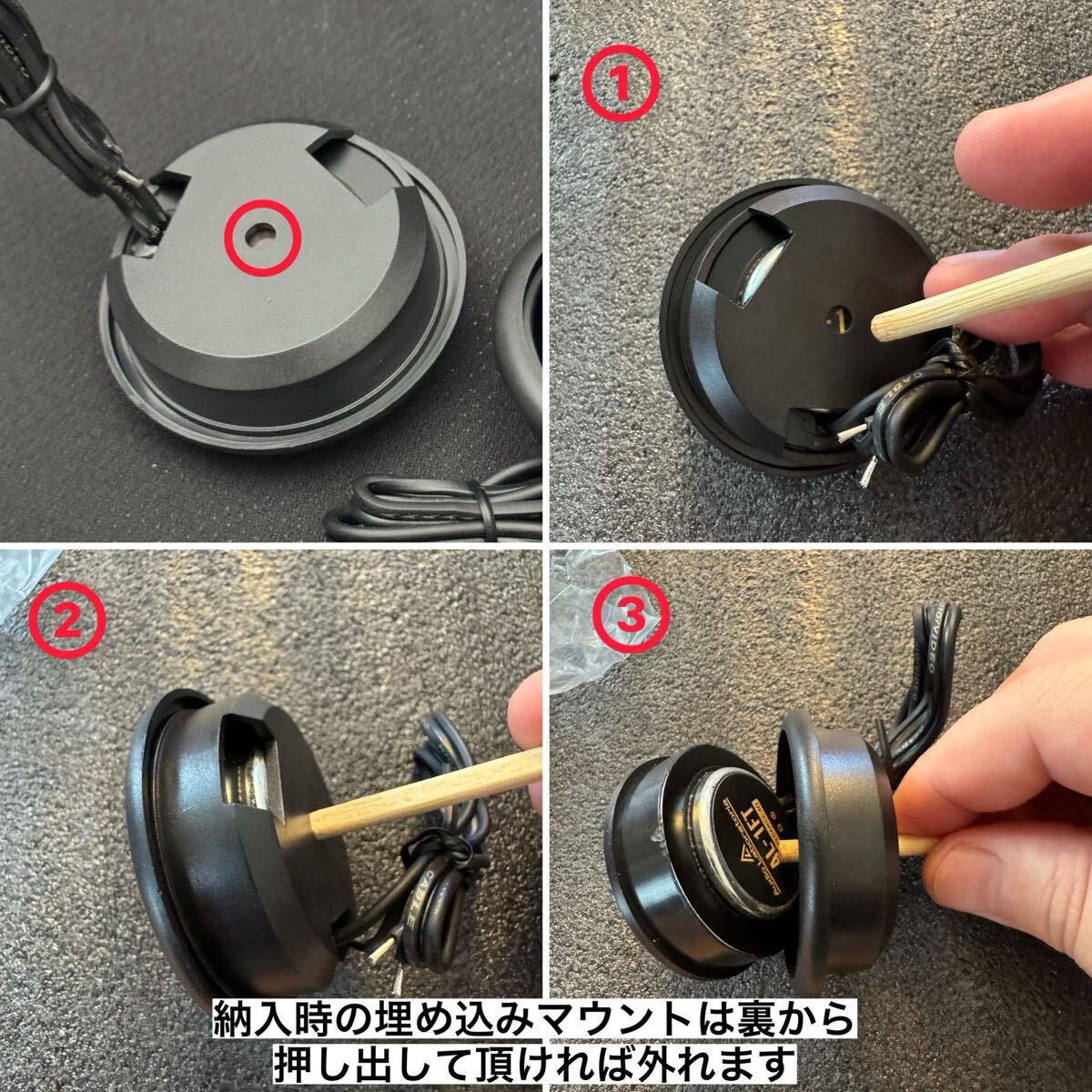 ・ツイータ―に関して、納品時は梱包の都合上、埋込マウントへ収まった状態で梱包されております。オンダッシュマウントをご使用の際は埋込マウントの裏側からツイーターユニットを押し出して外してご使用下さい。ツイータ―の極性はツイータ―ユニット背面に記載されております。
