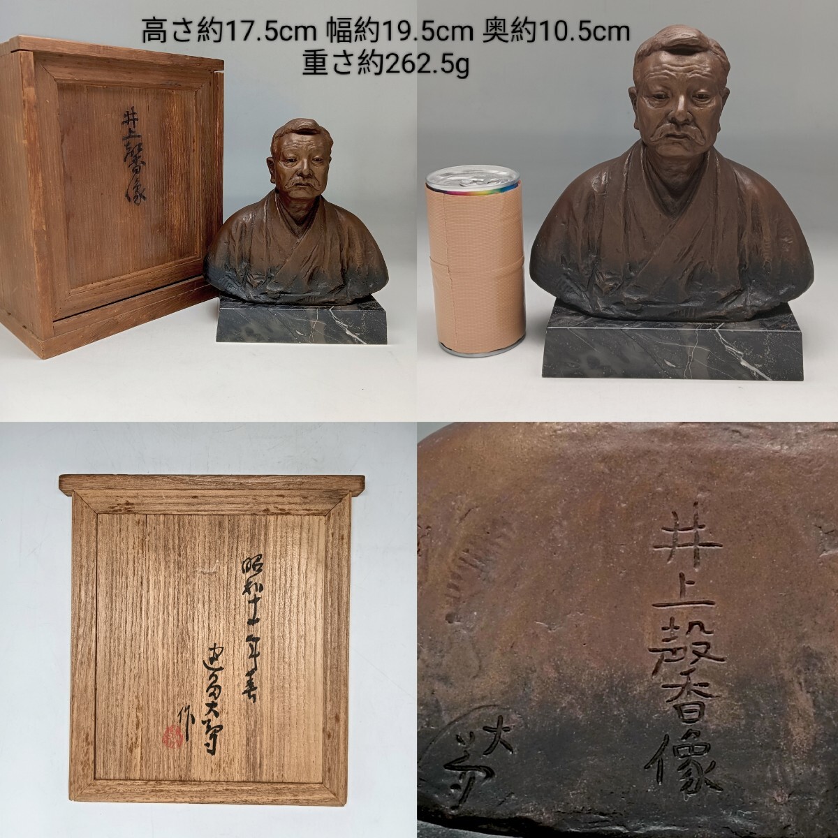 【A4108】昭和十一年 彫刻家 建畠大夢「井上馨像」ブロンズ 銅像 置物 大理石台座 東洋彫刻美術 飾り物 骨董品 アンティーク 共箱