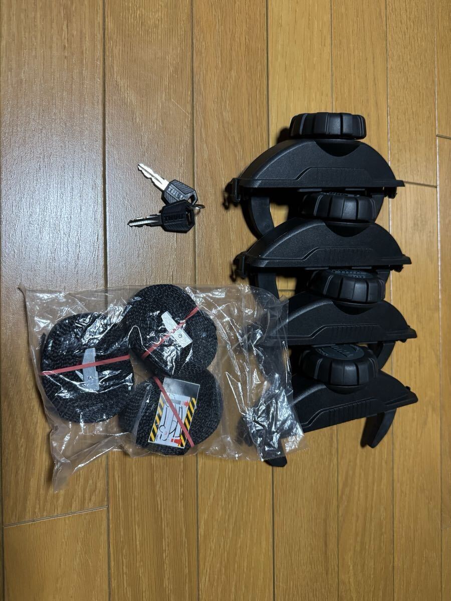 付属品は写真9のとおり。鍵2本、ベルト3本(未使用)、固定器具4つ