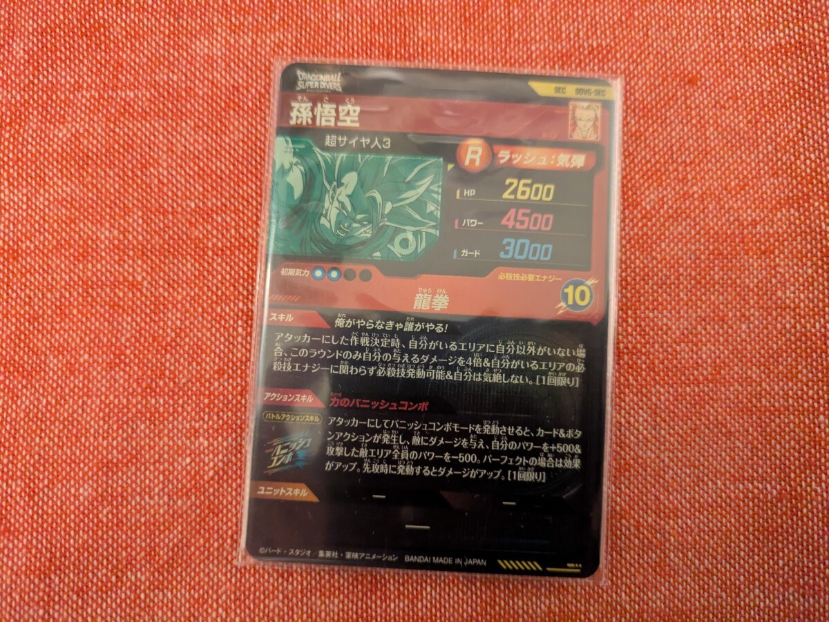 出品商品はドラゴンボールスーパーダイバーズ6弾、SECの孫悟空となります。 対人戦でかなり使える一枚。この機会に是非ご検討ください。折れ、濡れ対策し発送対応させて頂きます。