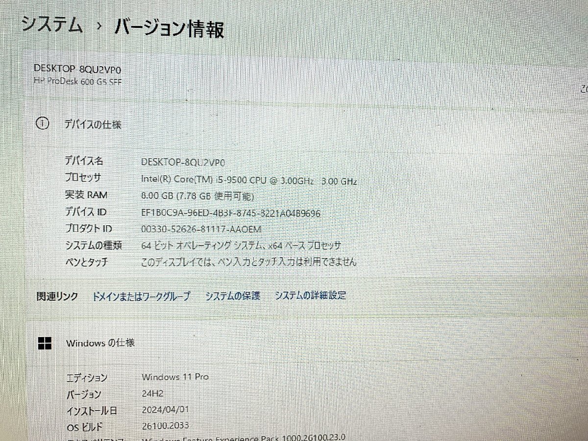 Product name: 【1円スタート】【動作確認済】HP / HP ProDesk 600 GS SFF / i5-9500 CPU @ 3.00GHz / 8GB / HDD500GB / Windows11Pro