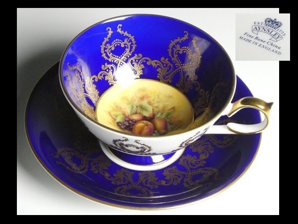 エインズレイ 最高級シリーズ オーチャードゴールド ⑤ 希少カラー コバルト&ゴールド フルーツ絵 ハイハンドル カップ&ソーサー n566