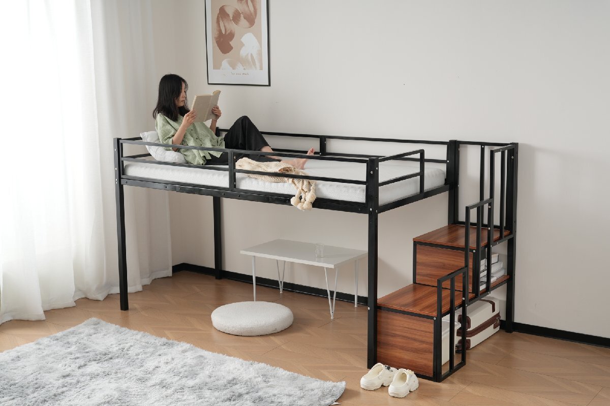 Product name: 【国内発送】新作 ブラック ロフトベッド パイプベッド 階段付き シングルベッド ロータイプ ロフトベッドロータイプ 木 収納 北欧風 お