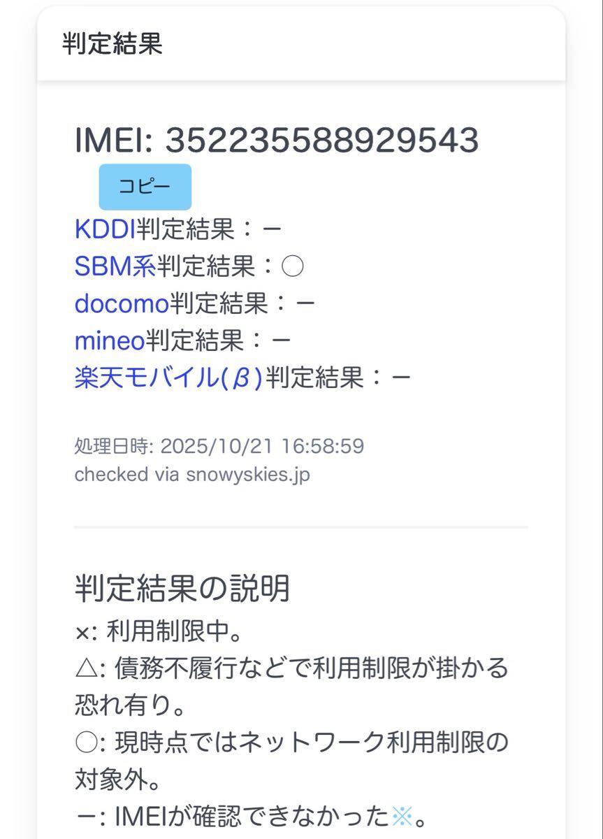 ◯ネットワーク利用制限の状況 : 「ドコモ=‐」 「KDDI=-」 「ソフトバンク=◯」「Rakuten=‐」