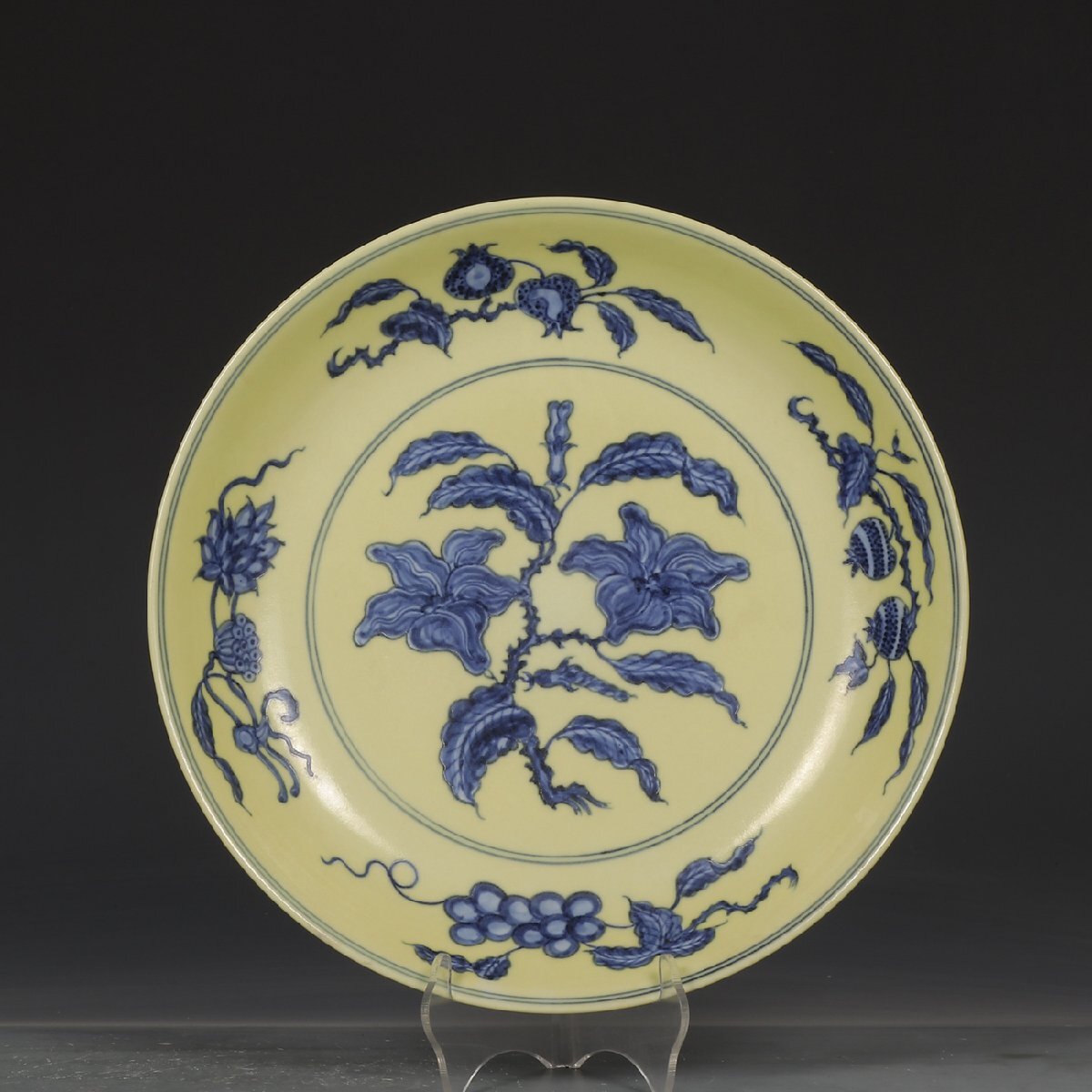 Product name: 【安】明時代 大明成化年製 黄地青花折枝花果紋盤 共箱 唐瓷 染付 古陶瓷 中国古美術 古董品 243