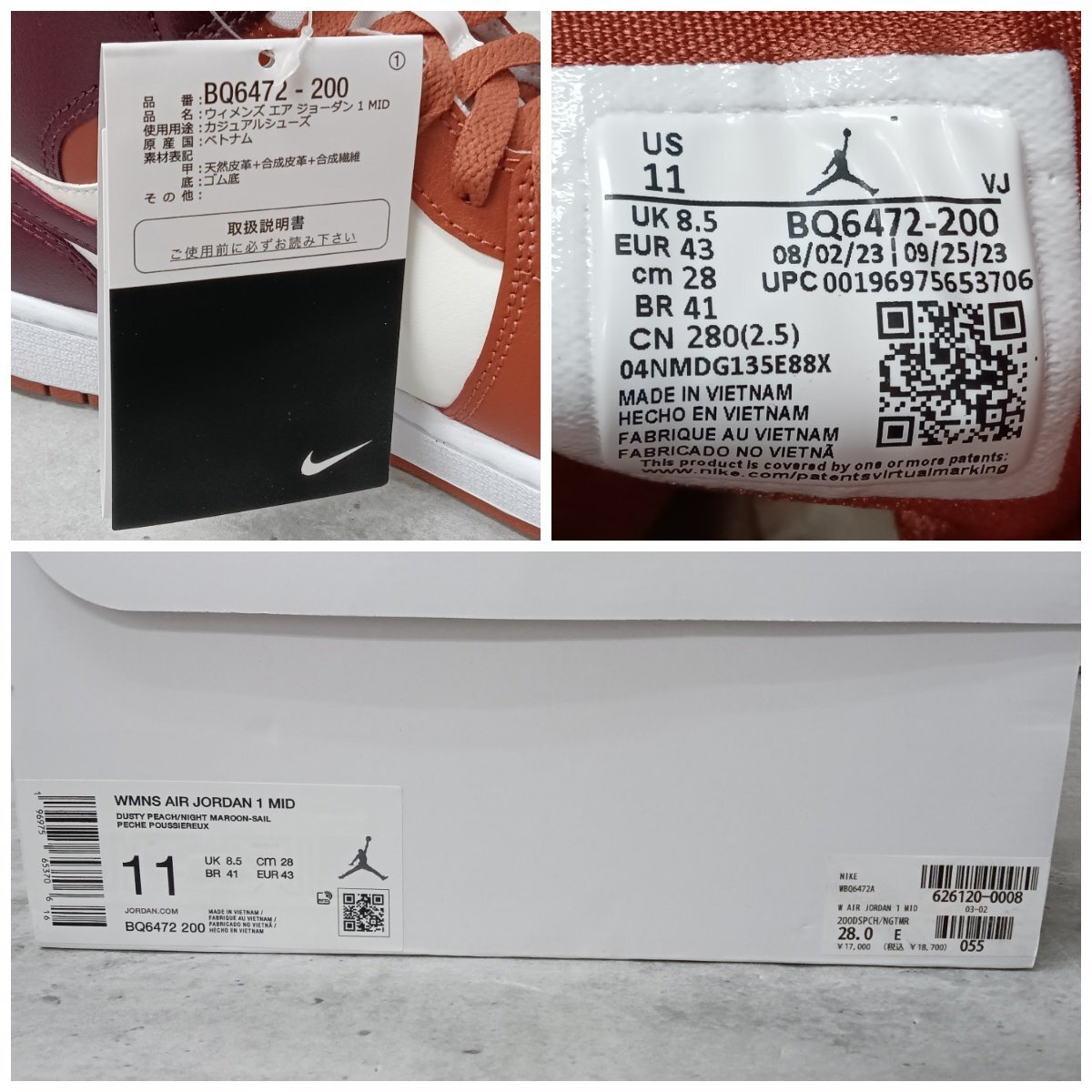 Product name: Nike Women's Air Jordan 1 Mid ナイキ エアジョーダン1 ミッド ダスティーピーチ/セイル/ホワイト BQ6472-200 28cm スニーカー 店頭展示品