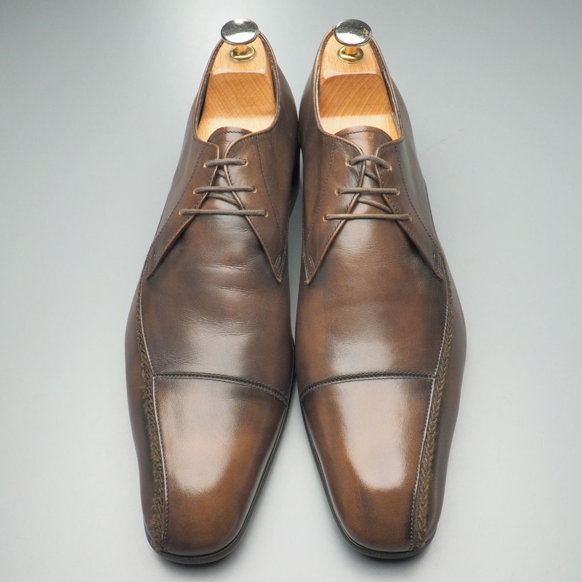 柔軟な茶のスムースレザーをアッパーに用いたキャップフロントの3アイレットダービー。