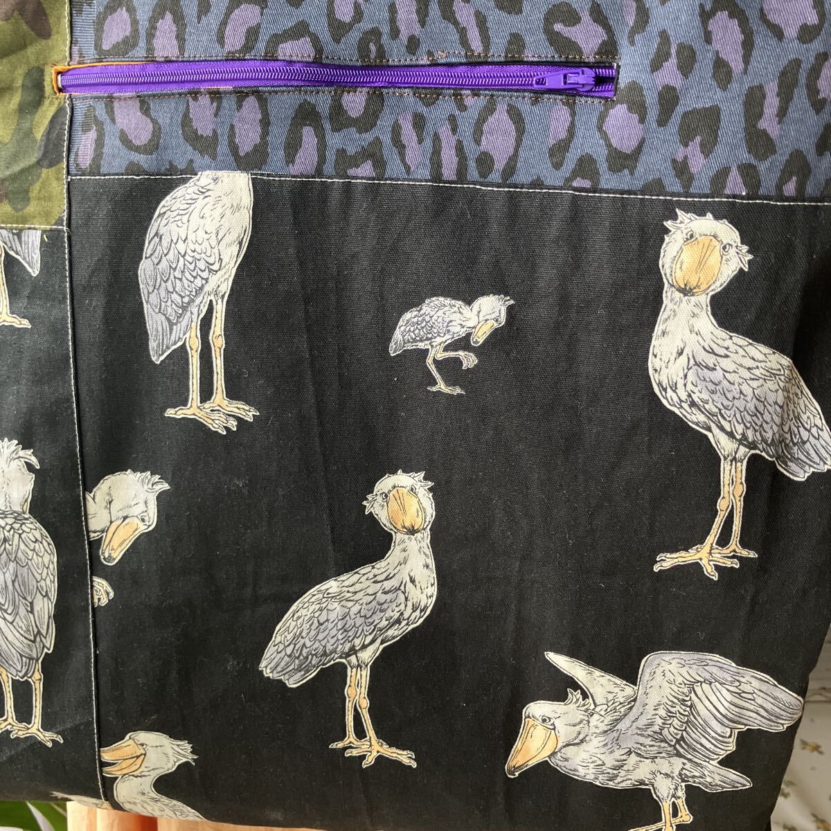 ハシビロウもいる動物生地などを繋いだ大きな手提げとふんわりポーチを作りました。