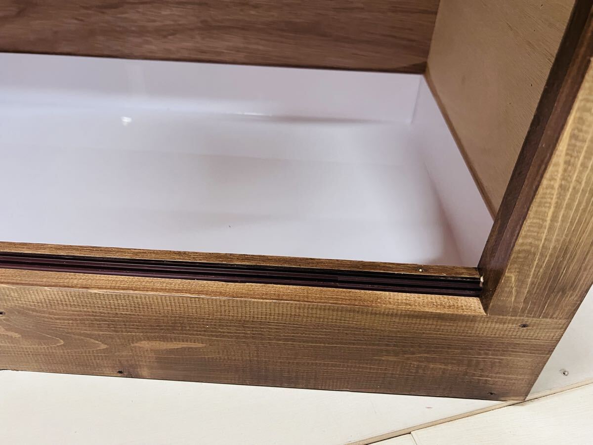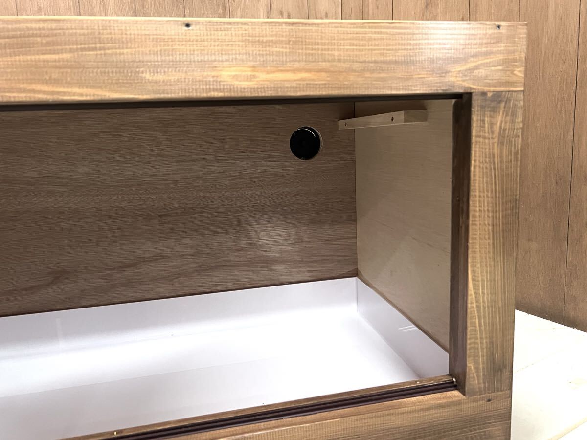 ケージ内の底も特注で高さ約70mmまで樹脂製トレーを貼りめぐらしておりますので生体の排出物等の液体も木製部分に染み込むことがないかと思います。(約70mm以下なら低床を多少湿らせても問題なかったです。)