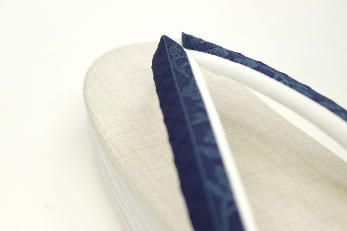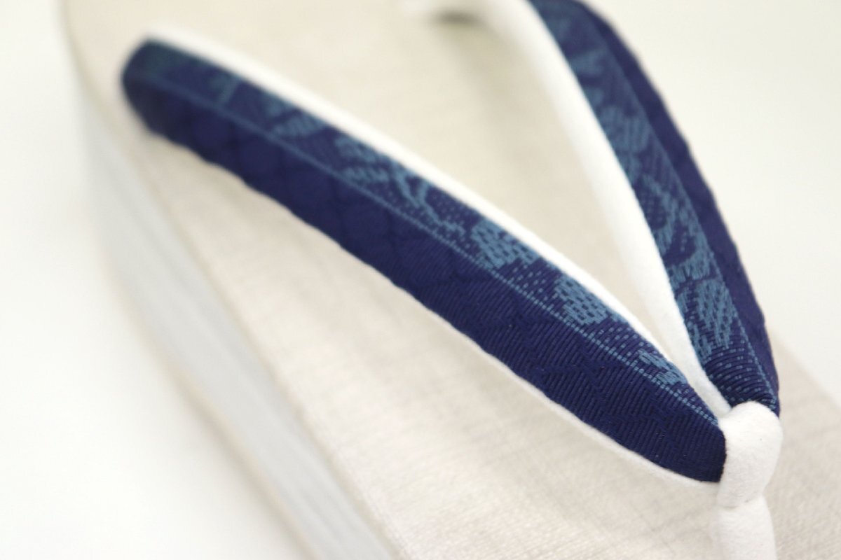 鼻緒には、紺色のお色目で植物模様が織り上げられた博多織の生地が使われており、白色の裏地が付いた鼻緒がすげられております。