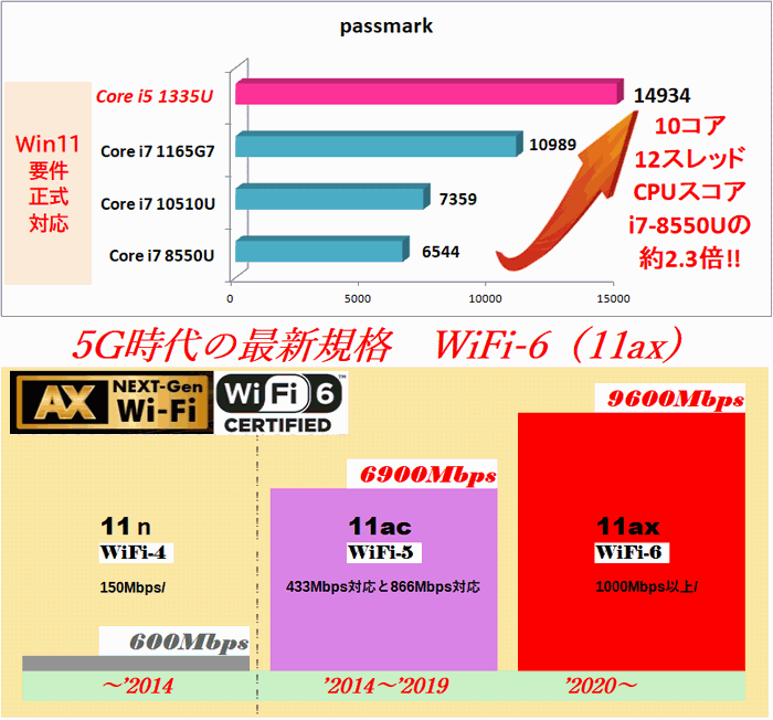→ 高速・安定通信でオンライン作業も快適 ※最新規格WiFi6E:従来の周波数帯に加えて6GHz帯が新たにサポートされ、通信速度は最大2.4Gbpsが可能。WiFi6E(11ax対応) ax211を搭載。