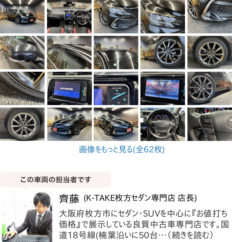 K-TAKE枚方店は国産セダン・SUV・ステーションワゴンを中心に取り扱いしております。趣向性の高い車種になりますので、専門知識を持ったスタッフにてご案内させて頂きます。コーティングやカスタム等はもちろん、任意保険、オートローンまで安心のカーライフをお約束致します。整備、保証などのアフターサービスも当店ですべて行えますのでご安心ください。当社は全国のオークション会場、約160カ所と業務提携を結んでおります。全国60000台以上の中古車を当店でご商談、ご契約、ご納車可能です!