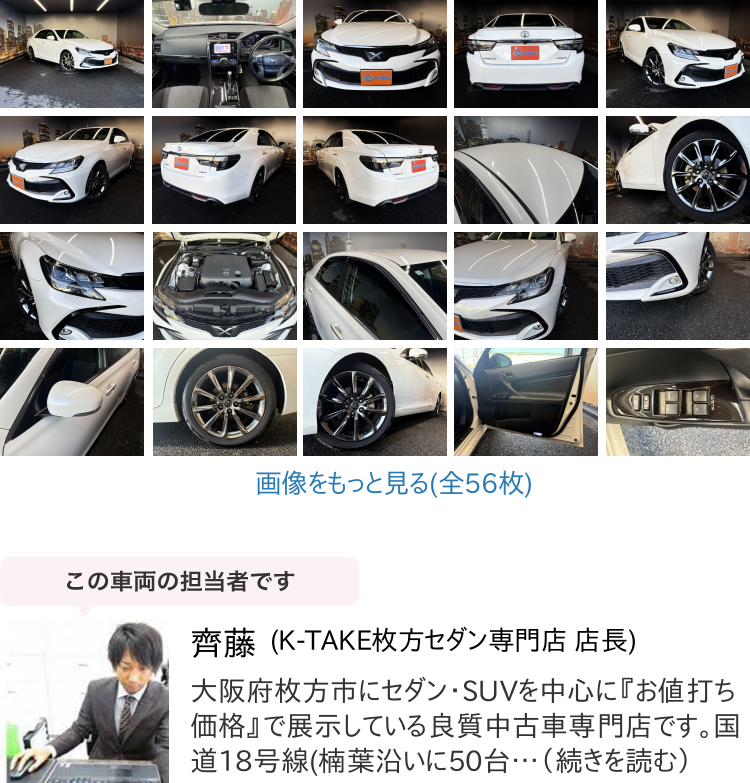 K-TAKE枚方店は国産セダン・SUV・ステーションワゴンを中心に取り扱いしております。趣向性の高い車種になりますので、専門知識を持ったスタッフにてご案内させて頂きます。コーティングやカスタム等はもちろん、任意保険、オートローンまで安心のカーライフをお約束致します。整備、保証などのアフターサービスも当店ですべて行えますのでご安心ください。当社は全国のオークション会場、約160カ所と業務提携を結んでおります。全国60000台以上の中古車を当店でご商談、ご契約、ご納車可能です!