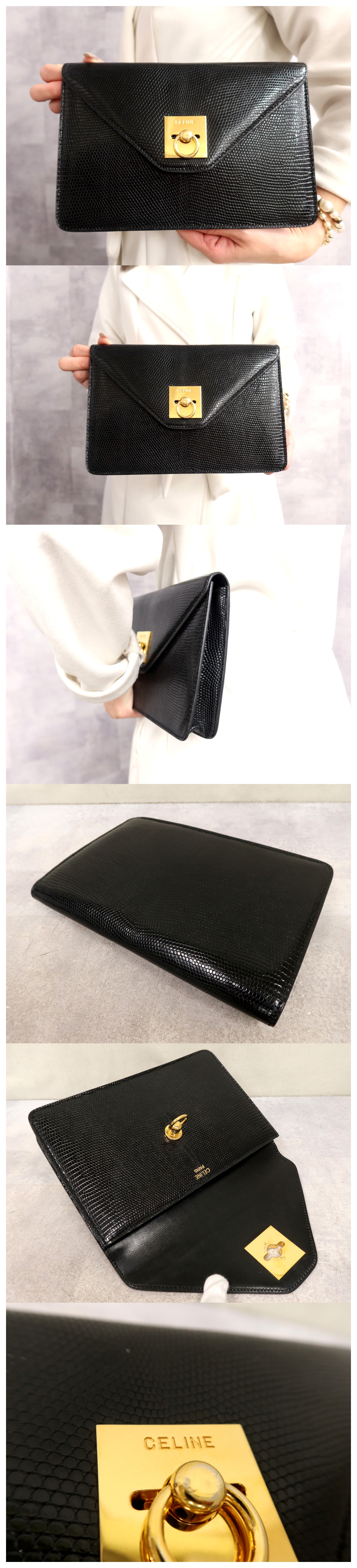 Store ●超美品●CELINE セリーヌ●ガンチーニ●リザード 本 トカゲ 革●セカンド クラッチ バッグ●黒●ゴールド金具●かばん●Js64642