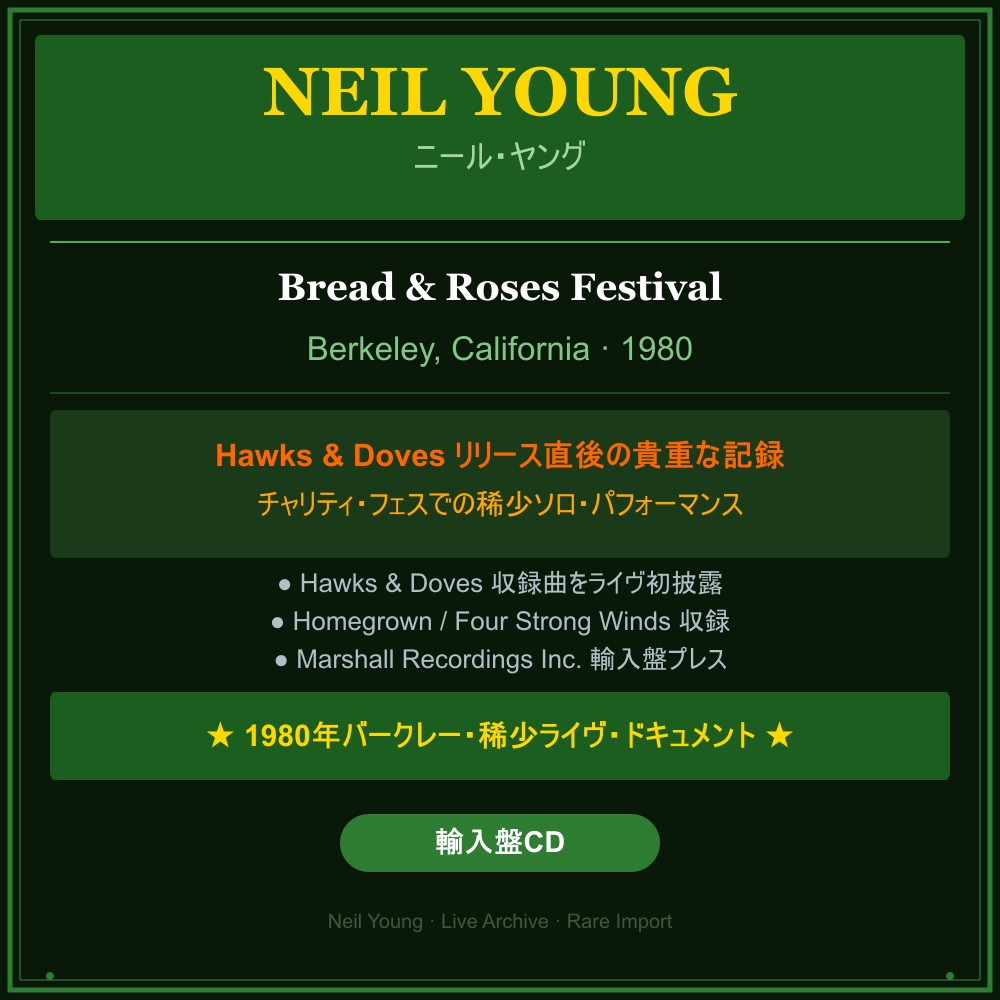 ●Neil Young / ニール・ヤング● Bread & Roses Festival Berkeley, California 1980 輸入盤CD