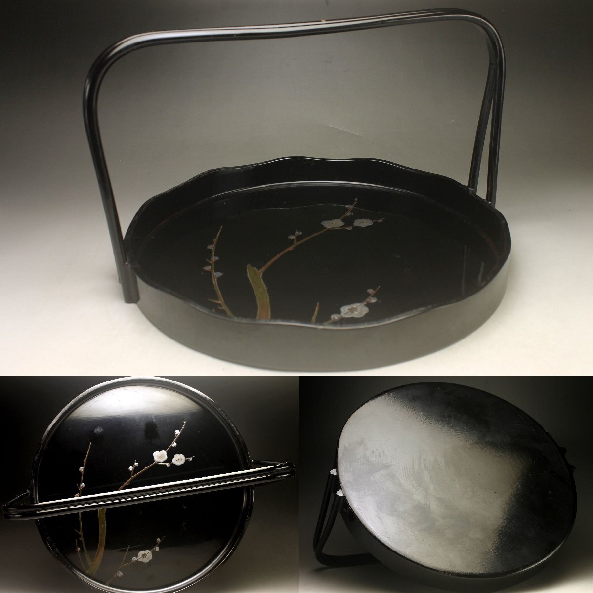 Product name: 【余韻】 時代物 黒漆銀彩梅文蒔絵付 手付盆 盃盆★時代漆器 蒔絵大名道具 骨董品<同梱可>