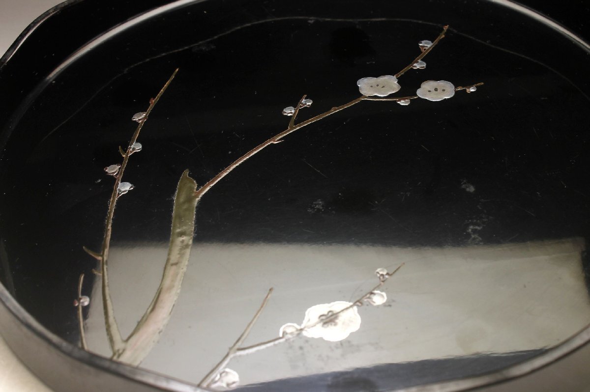 【余韻】 時代物 黒漆銀彩梅文蒔絵付 手付盆 盃盆★時代漆器 蒔絵大名道具 骨董品<同梱可>