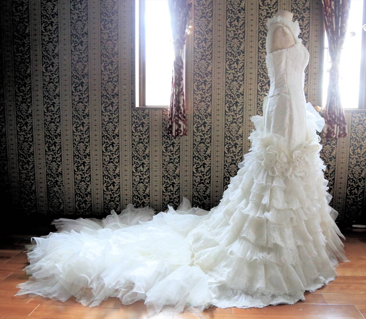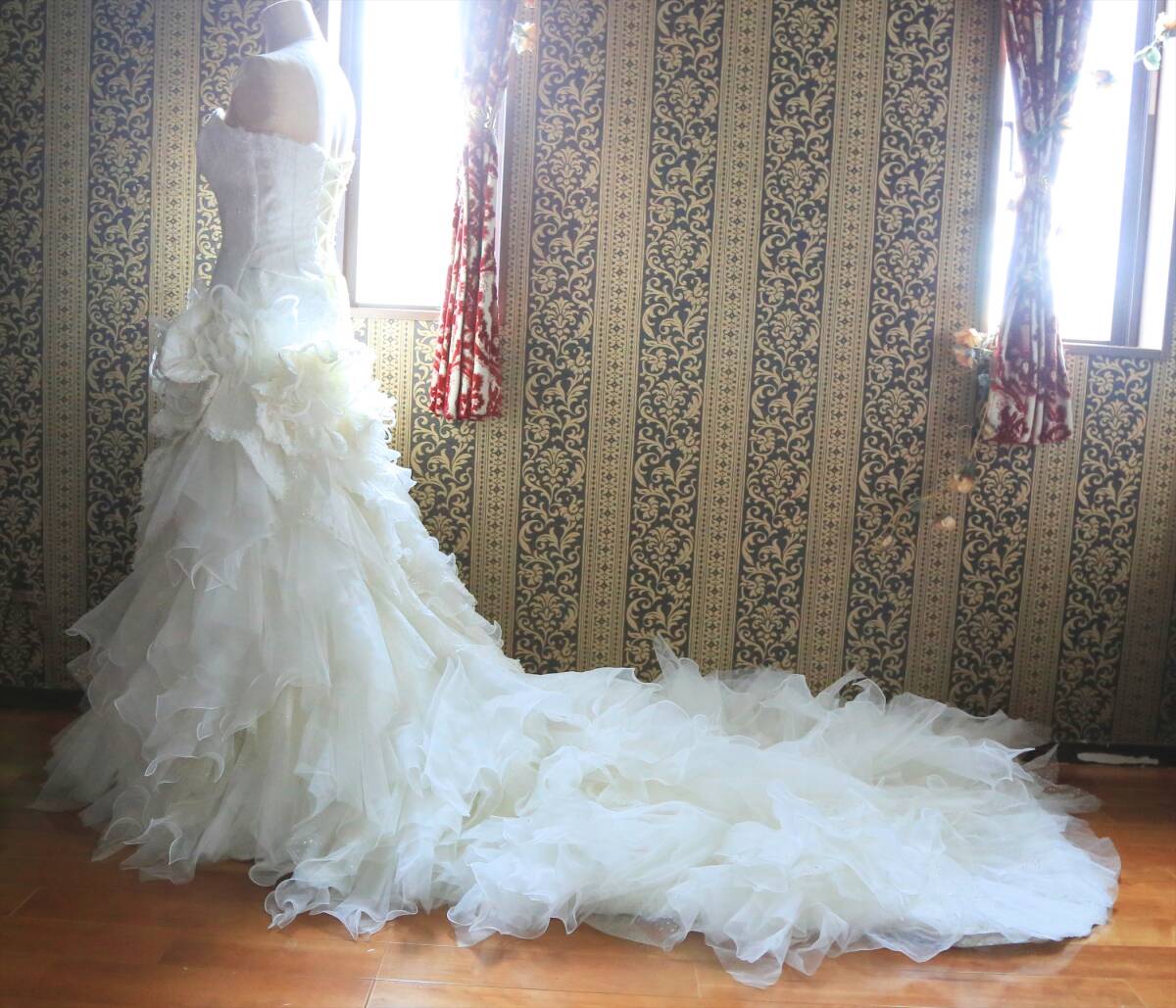 実寸はバスト約7281cm、ウエスト約5464cm、前中心から裾までの丈約130cm、脇下から裾までの丈132cm、後ろ丈約238cm、後ろ丈が長い作りとなっており豪華な印象です