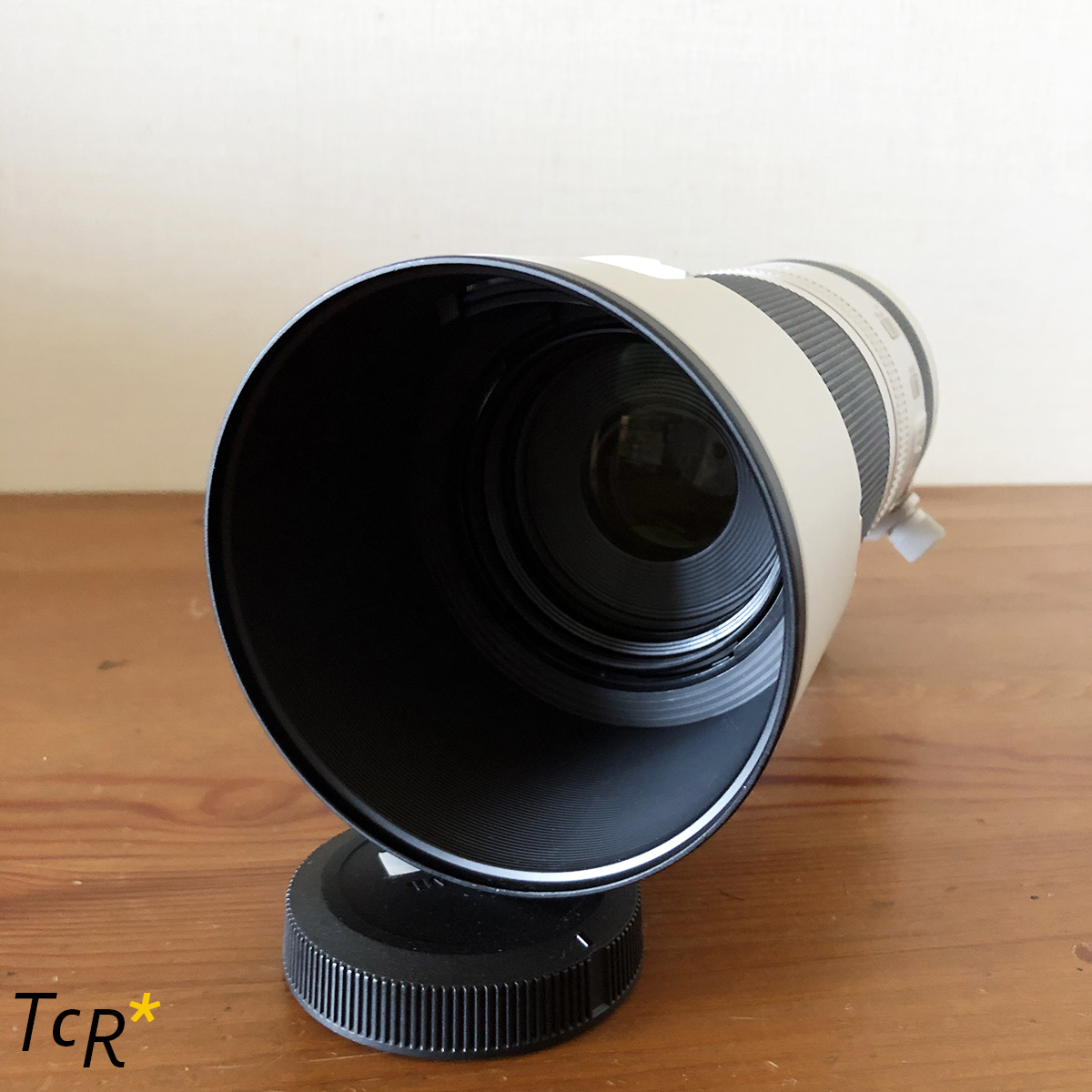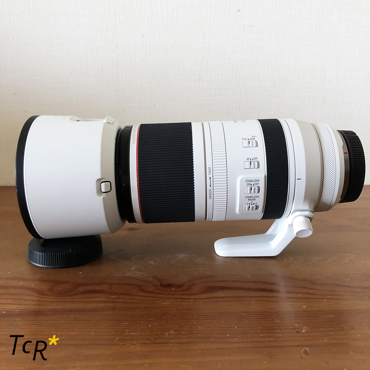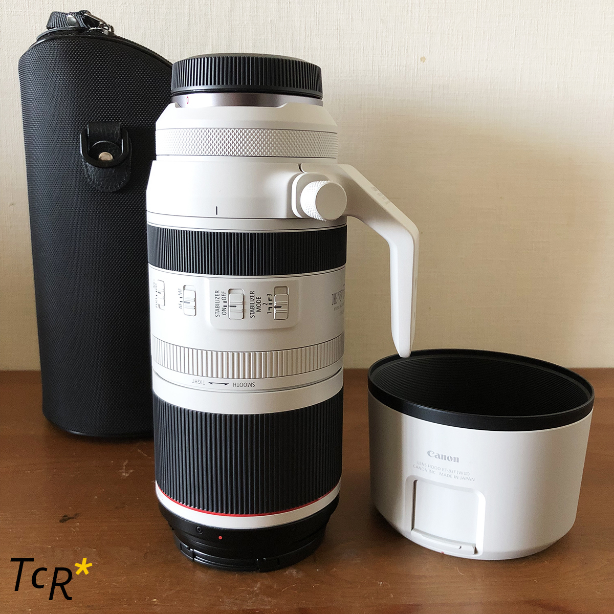 三脚座、レンズフード(ET-83F)、レンズキャップ(E-77 II)
