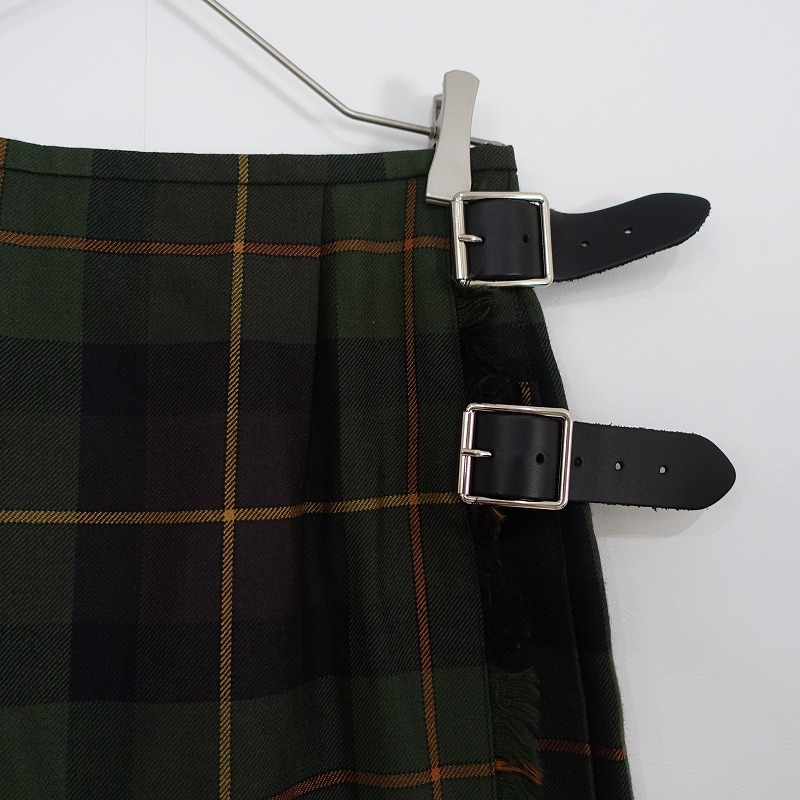 O’NEIL OF DUBLINのウールチェックキルトスカートです。カラーはグリーン・ブラック・ブラウン・キャメル・ライトブラウンで、チェック織地で仕立てられております。両サイドのベルト留めのラップデザインで、サイズ調整可能になっております。サイドからバックにかけてプリーツ入りで、フロント縁はフリンジになっております。別途シルバーのピンが付属されております。