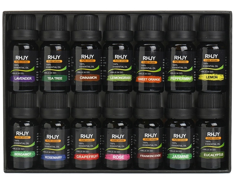 14本の内訳は以下になります: ローズ、ジャスミン、ラベンダー、ベルガモット、レモングラス、 レモン、フランキンセンス、ローズマリー、グレープフルーツ、 ペパーミント、スイートオレンジ、ユーカリ、ティートリー、シナモン