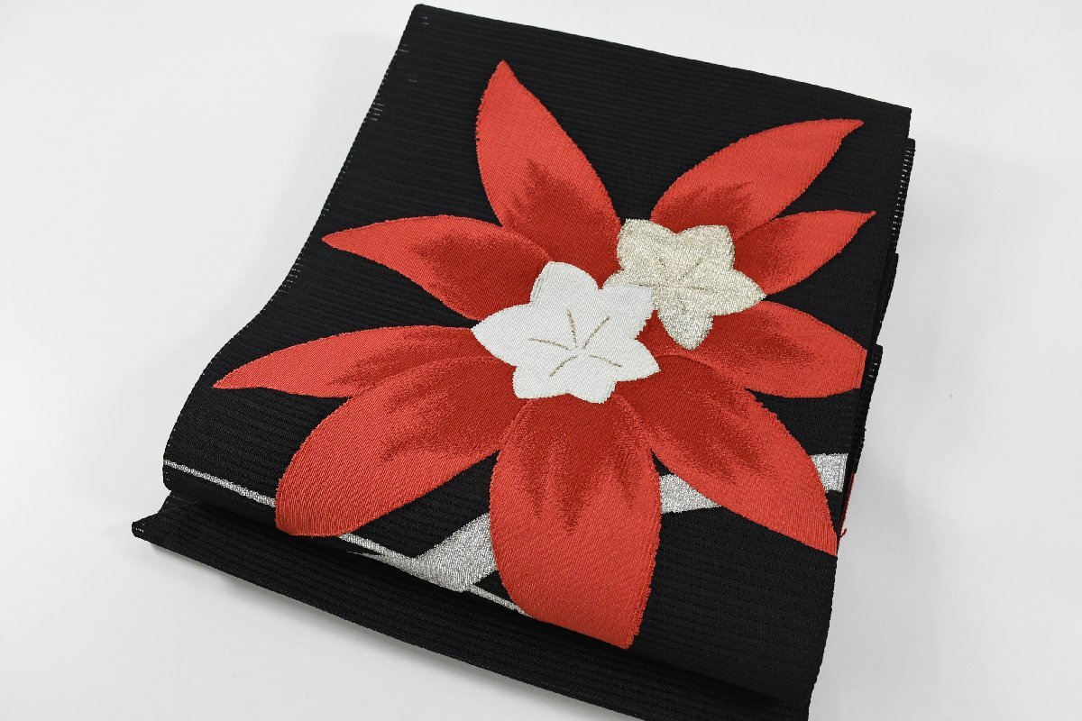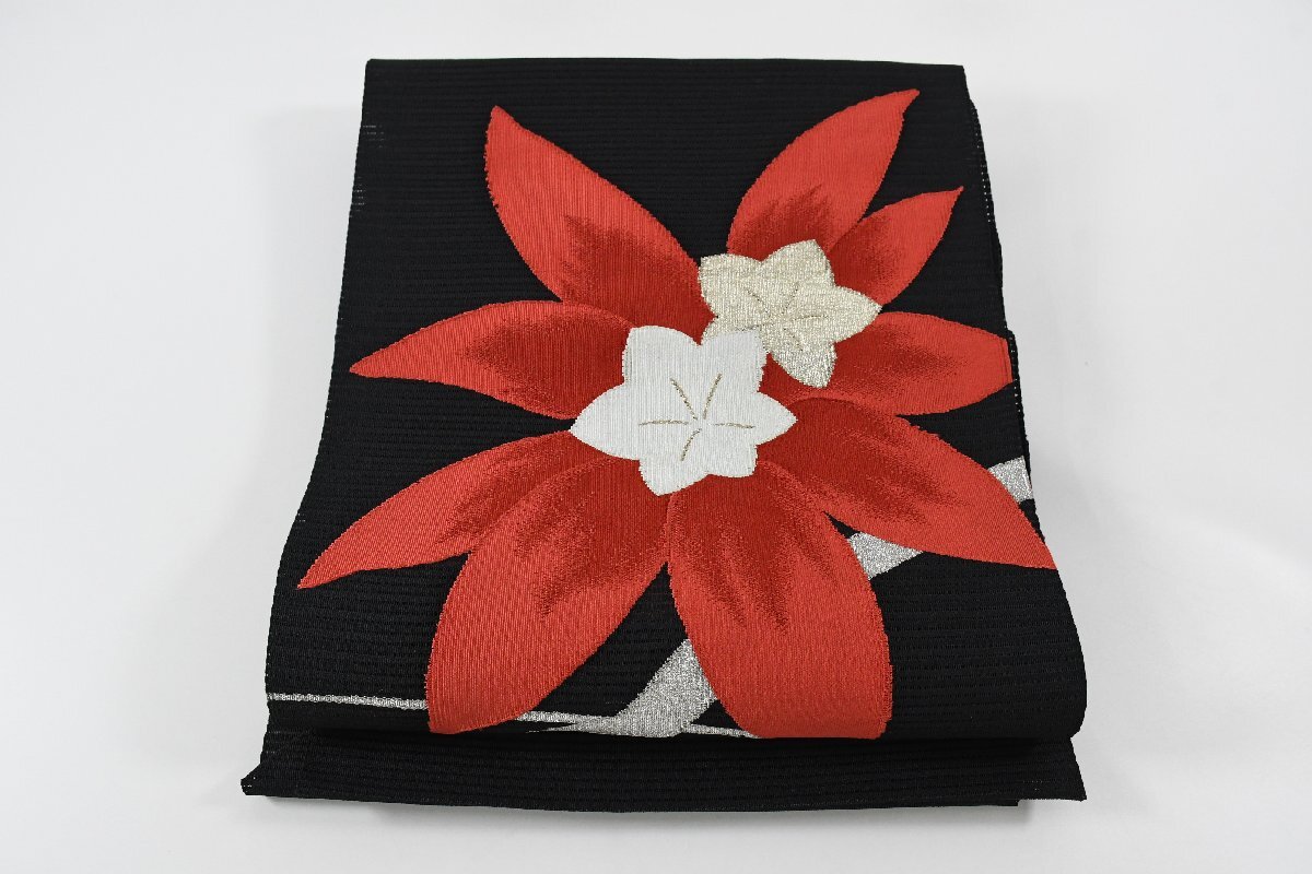 Product name: 袋名古屋帯 夏帯 黒 お太鼓柄 松葉仕立て 花 帯丈346cm ★着物屋 ne-15851 桜庭呉服店