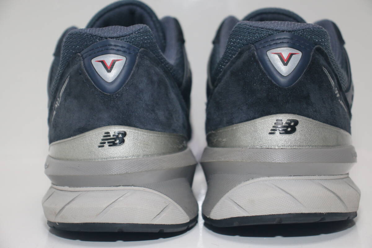 New Balance(ニューバランス)のスニーカー、990 V5で、アメリカの古着店で購入した中古品です。素材は主にレザー(スウェード) x ナイロン、色はネイビーで、Made In USAです。インソールは取り外し可能です。【箱は付いていません。】