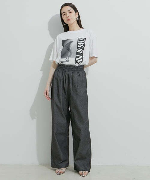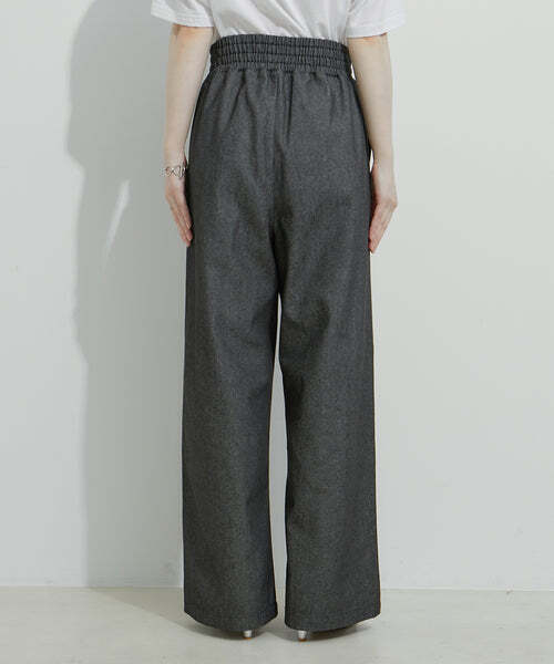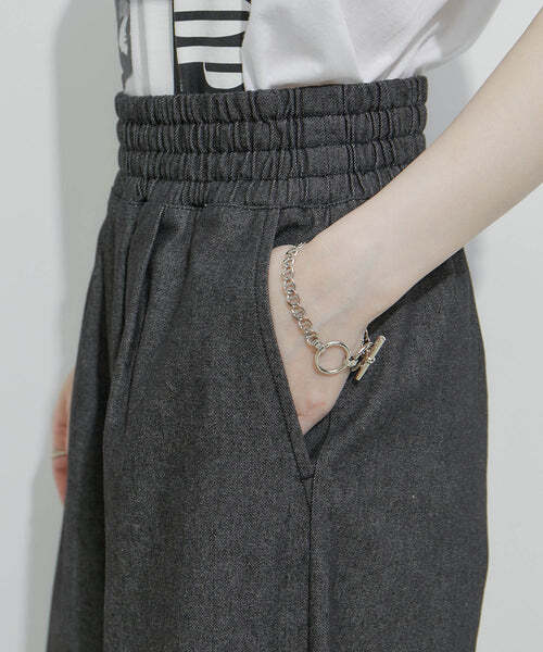 ウエスト位置を高く設定しているのでハイウエストで履いて頂くと自然と足長効果を感じて頂けるパンツになっております。また、ウエストぐるりゴム仕様になっているのでストレスフリーも嬉しいポイント!