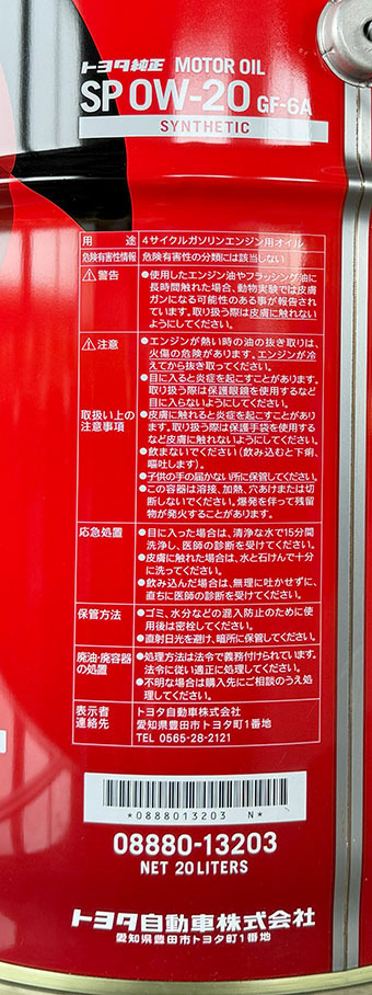API:SP SAE:0W20 ILSAC:GF-6A