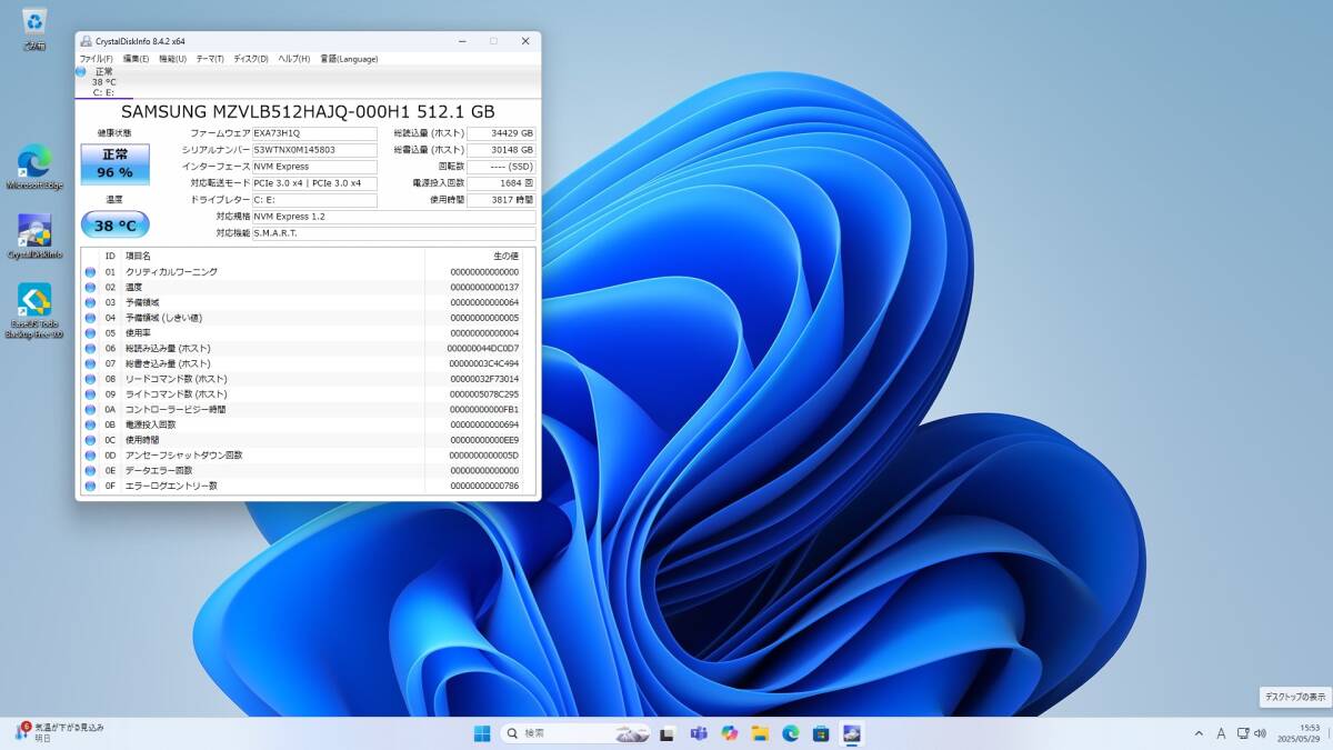 Storage :512GB SSD M.2 2280 PCIe 3.0x4 NVMe CrystalDiskInfo SSD情報画面/使用時間:3817H(7枚目写真参照 )