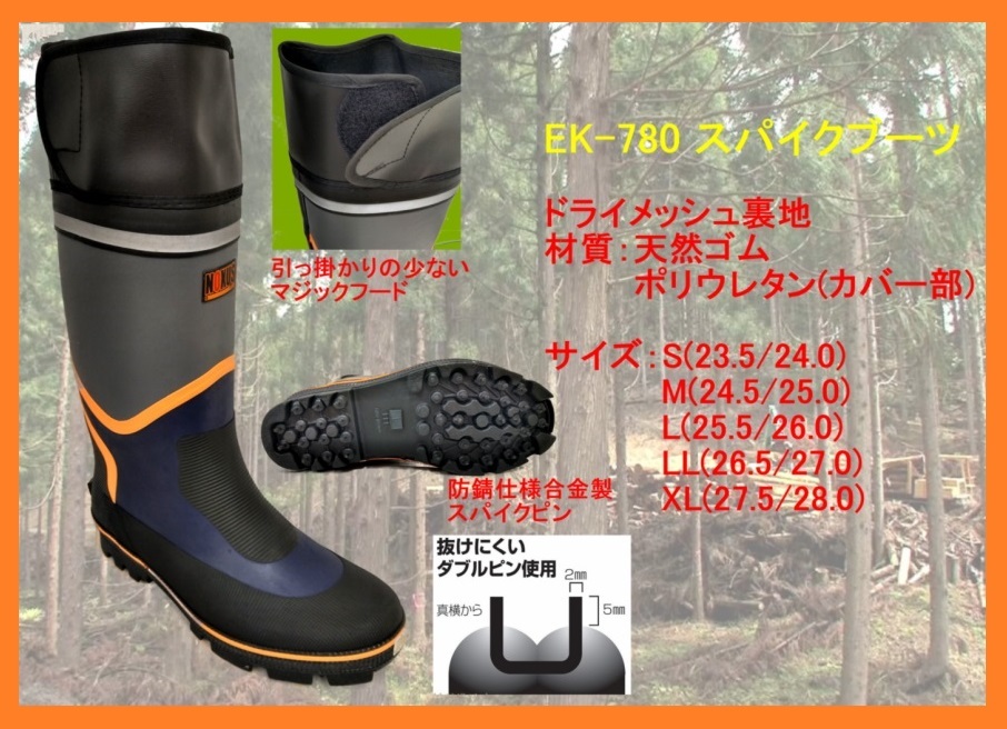 Product name: 780/格安!スパイクブーツ 作業長靴 LLサイズ 26.5-27.0cm 天然ゴム ドライメッシュ裏地 防錆ダブルピン フード付 山林業 農作業 土木建設