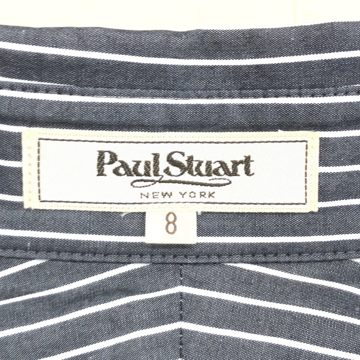 美品 Paul Stuart ポールスチュアート コットン100% スキッパーカラー ストライプ シャツ 8 グレー系 ブラウス 七分袖 レディース 婦人