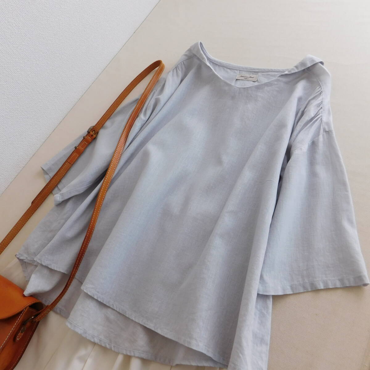 ダスティーなライトグレーカラーのブラウスがステキです。