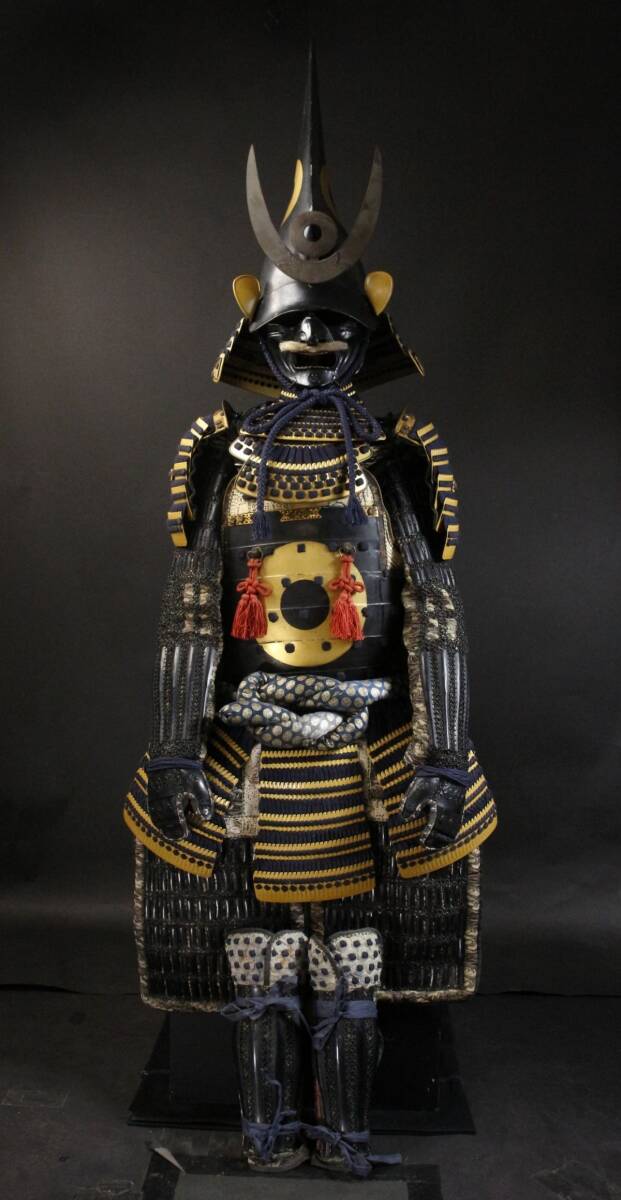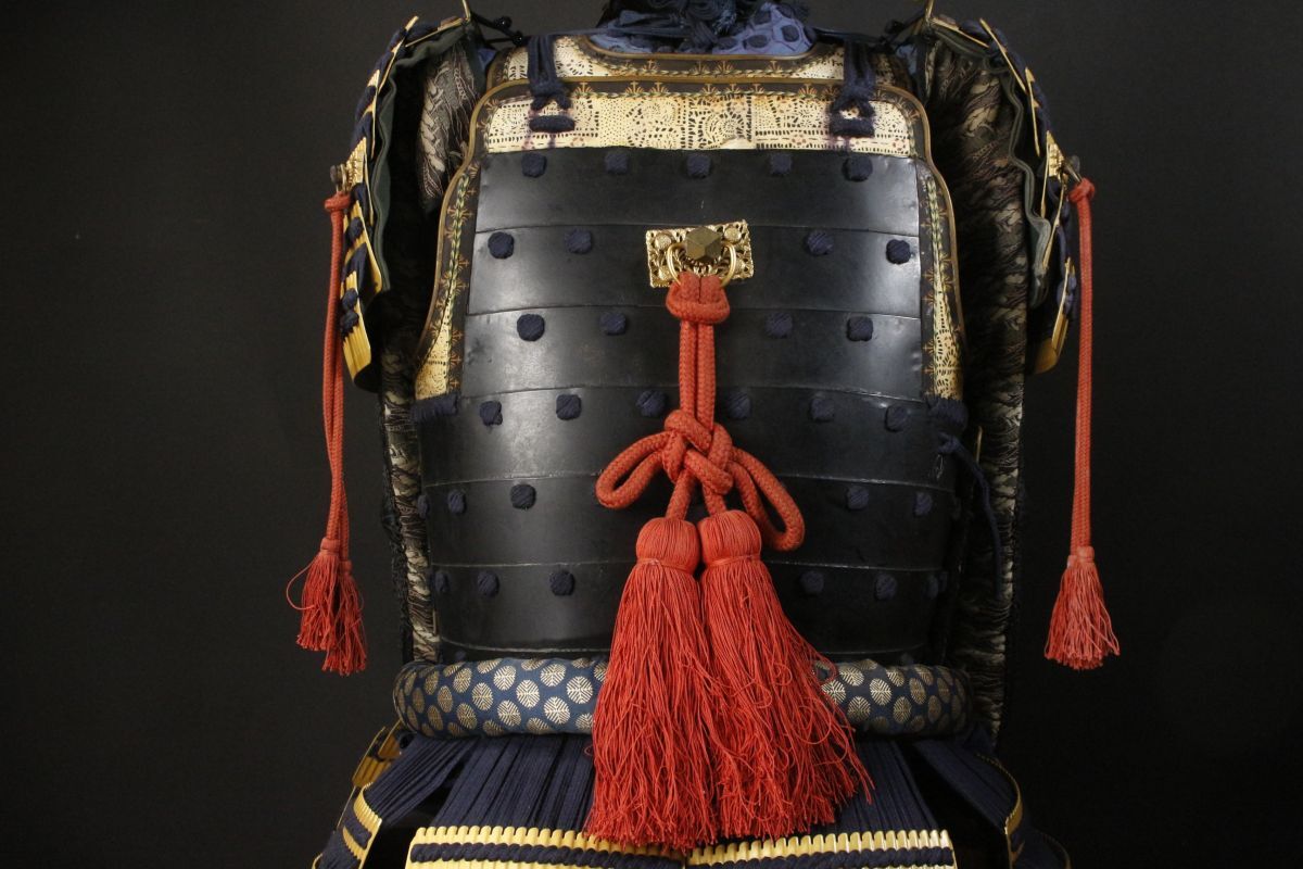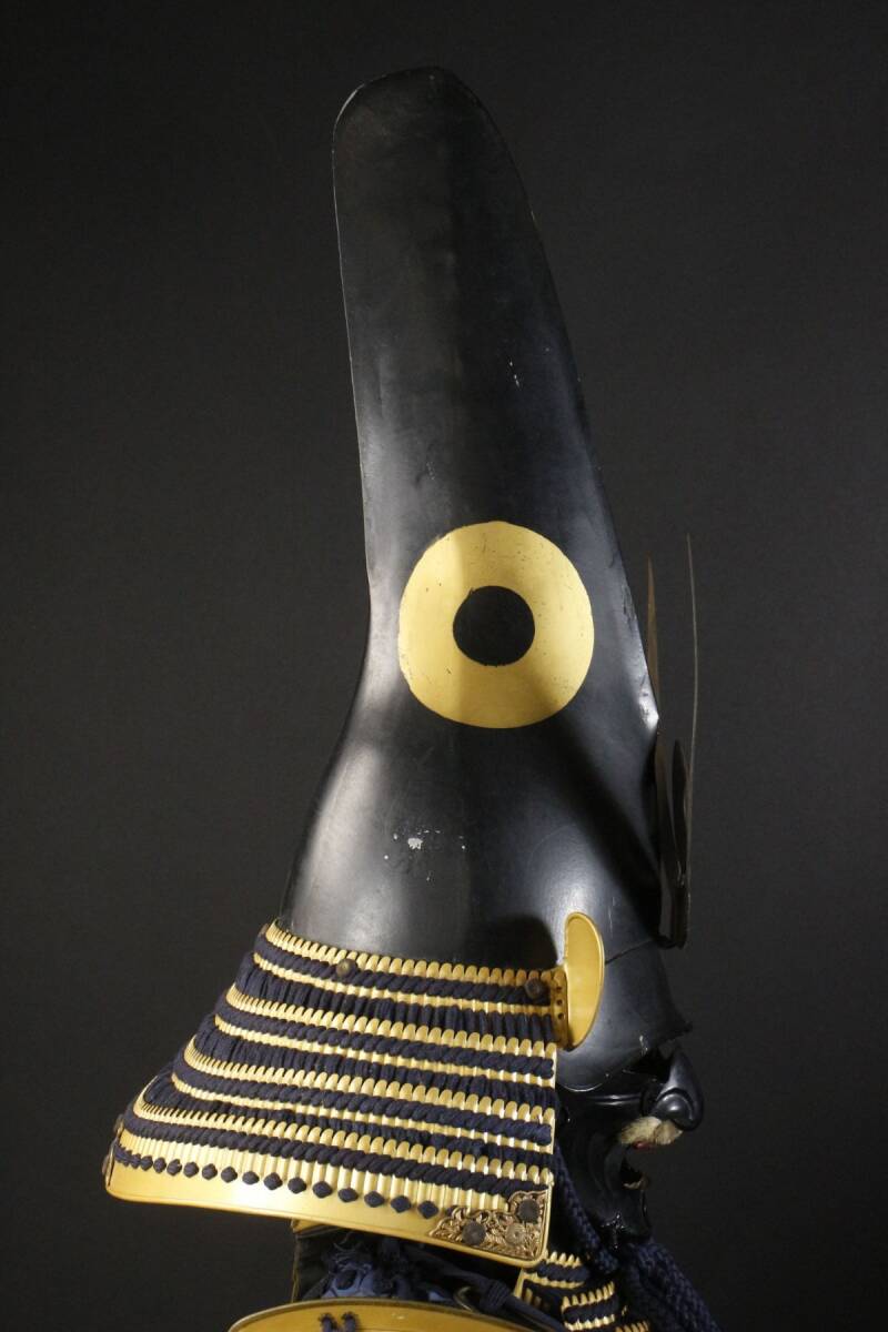 奇抜で立派な兜に胴に入った大きな家紋、引き締まった濃紺糸縅等