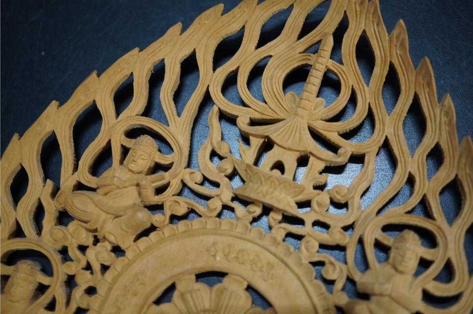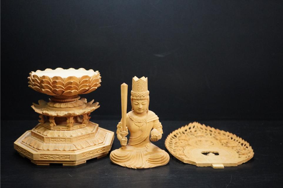 仏像 木彫 白木 細密彫刻 [虚空蔵菩薩像] 飛天光背 全高30.5cm 仏具です。