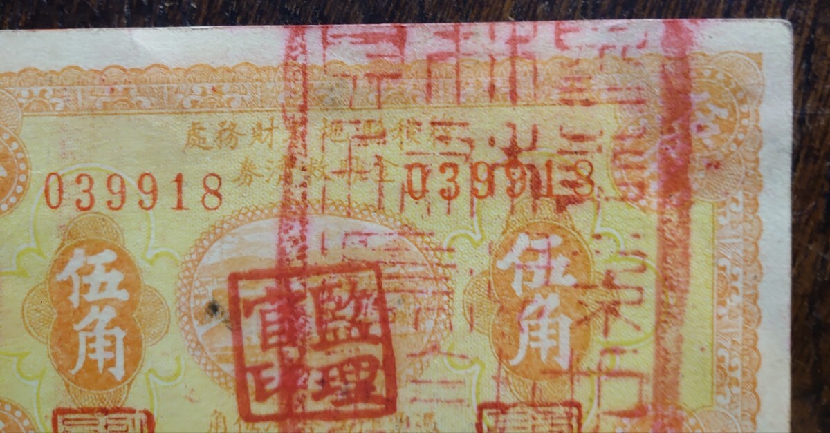 【戦前中国紙幣】『穆稜縣◯◯財務處金融救済券 伍角』民国二十◯年造 ◯の部分は判読不能 サイズ:横11.9cm 縦7.2cm 裏面に剥がし跡有