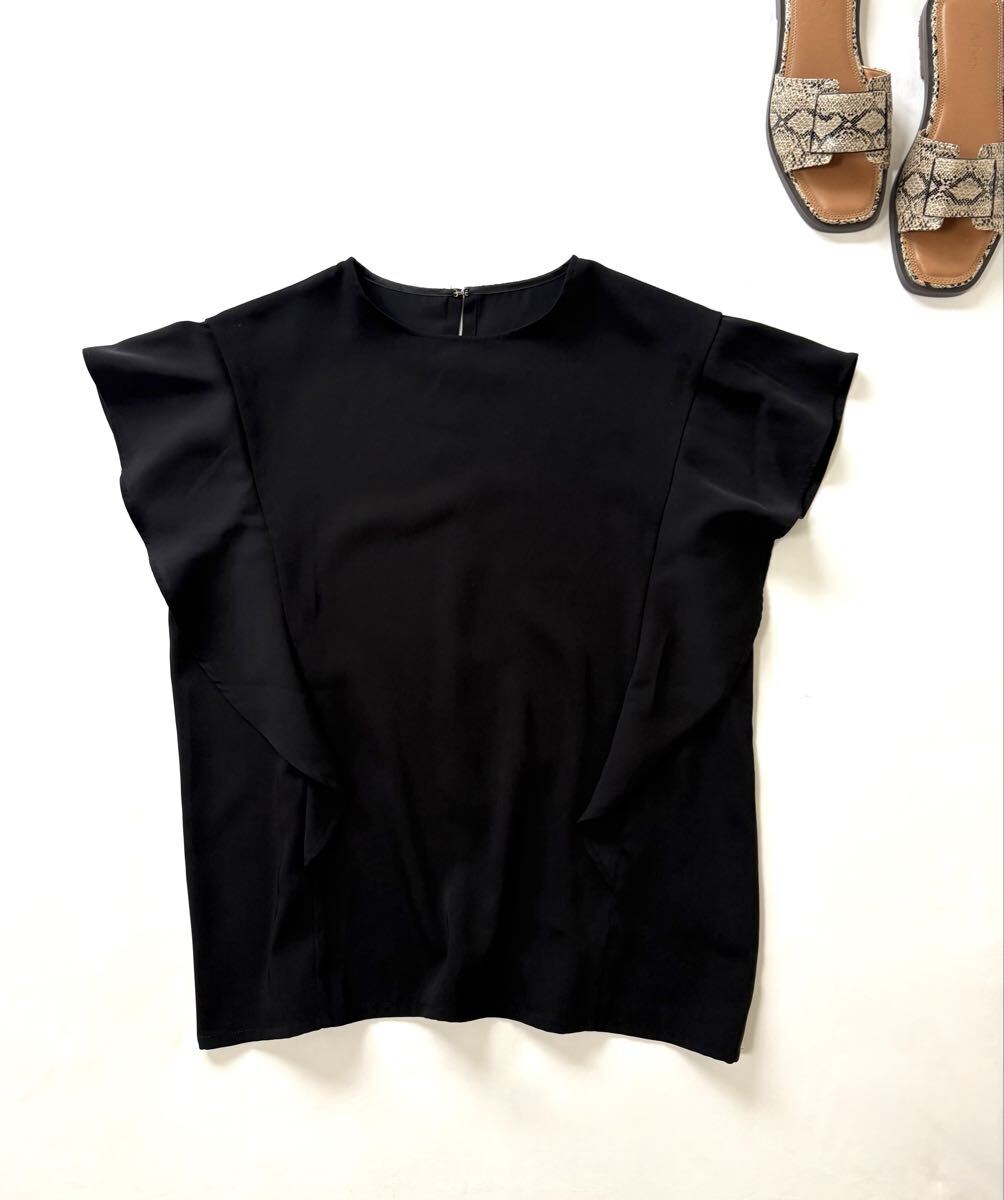 「AER ADAM ET ROPE アダムエロペ」のブラウスです。サイズ・・・フリー(身幅約49cm、着丈約60cm)。素材・・・ポリエステル100%。カラー・・・黒。定価・・・9900円。さらっとした素材で肌離れがよく、暑い時期にもおすすめです。動くたびに揺れるフレアスリーブが女性らしく、1枚で華やかになります。二の腕もしっかりとカバーしてくれます。数年前に購入し、何度か使用しました。裏面のミシンステッチに(糸の部分)少し毛羽たちがあります(写真でご確認ください)。目立つダメージはないですが、あくまでユーズドですので、神経質な方はご遠慮ください。よろしくお願いいたします。