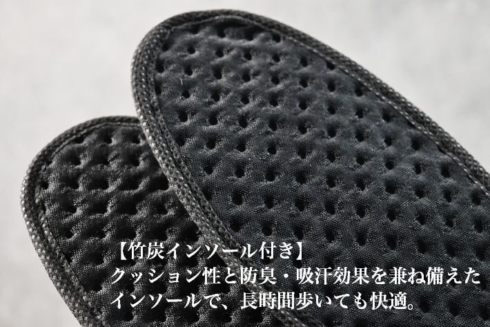 クッション性と防臭・吸汗効果を兼ね備えたインソールで、長時間歩いても快適。
